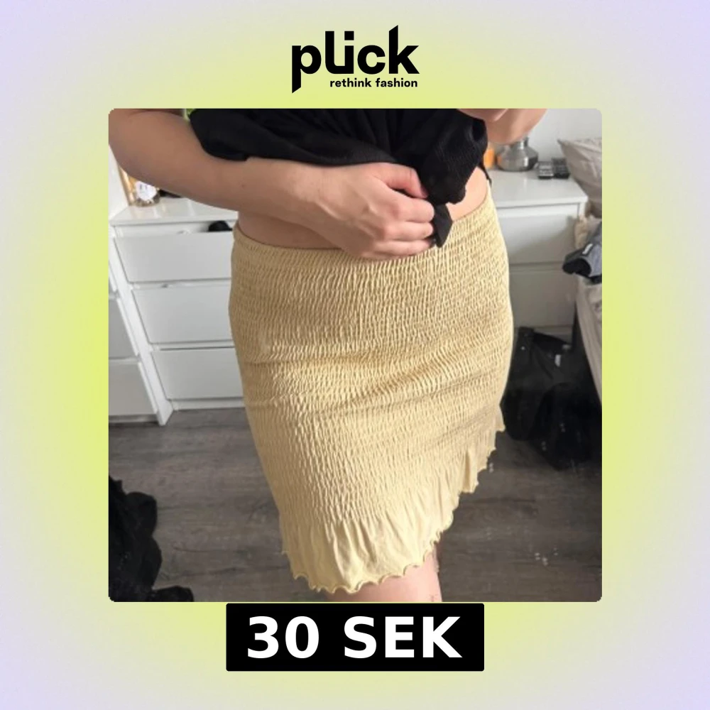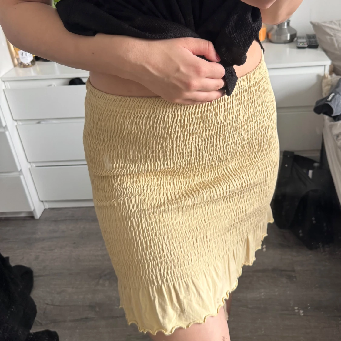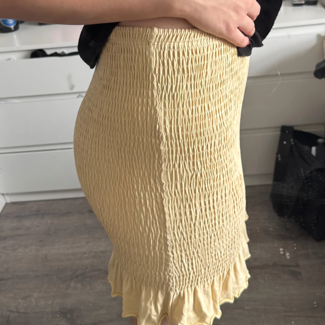 Gul ribbad kjol med volangdetalj i nederkant. Kjolen har en tight passform. (Katt och kanin finns i hemmet)