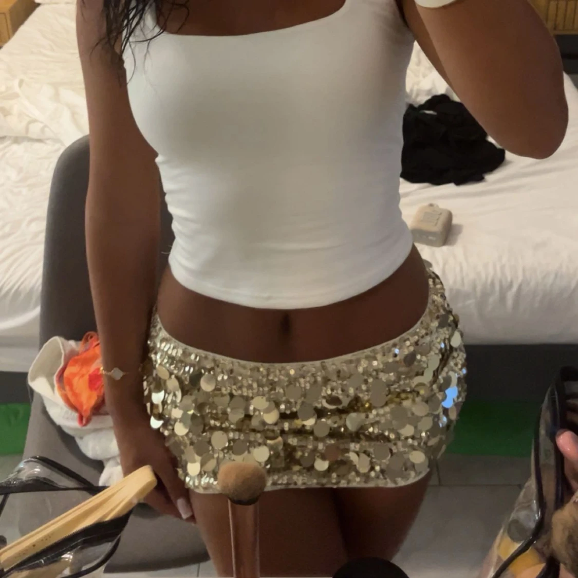 Superglittrig minikjol i guld med stora paljetter som reflekterar ljuset. Kjolen har en tight passform och sitter högt i midjan, perfekt för att sticka ut på dansgolvet. Materialet är syntet och paljetterna ger en extra festlig vibe.