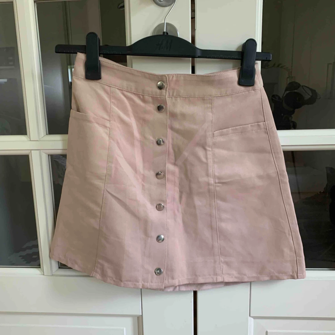 Högmidjad kjol i mockaimitation med knäppning. Sparsamt använd. Frakt tillkommer