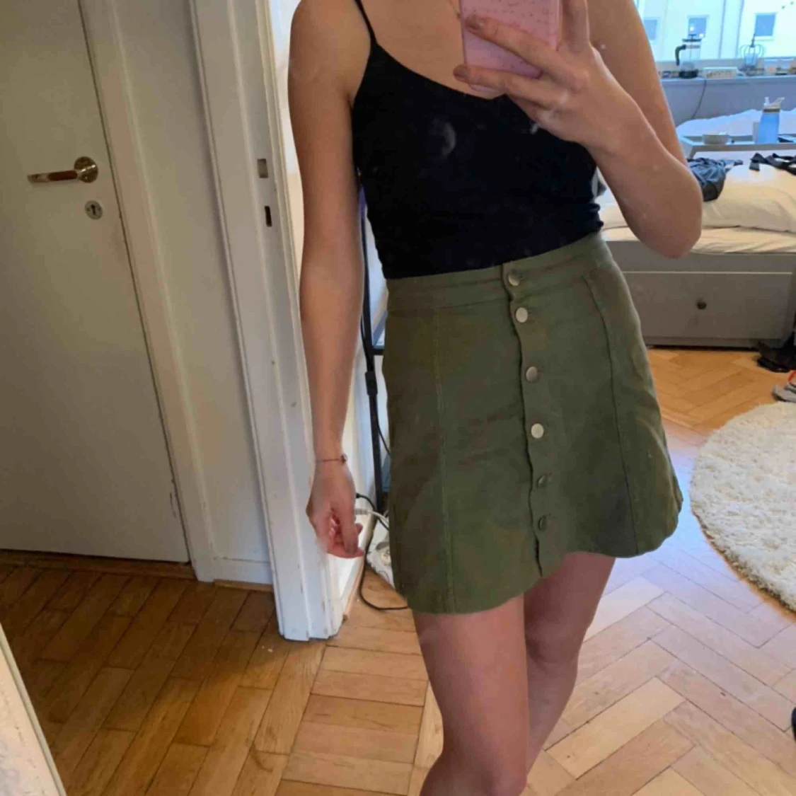 Militärgrön kjol med knäppning framtill. Priset är exklusive frakt.