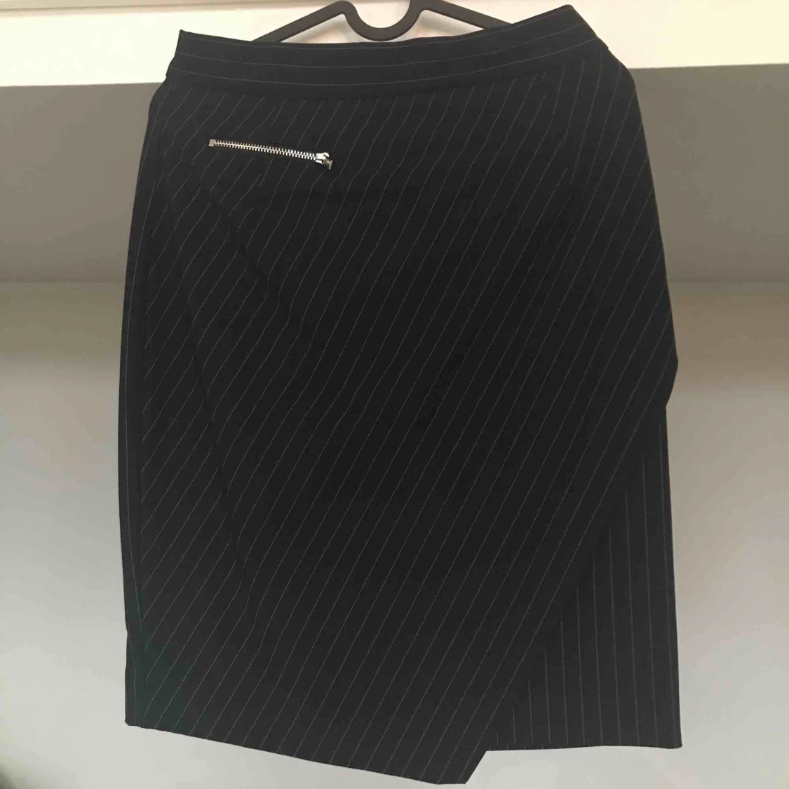 Snygg kritstrecksrandig kjol med dekorativ dragkedja på framsidan. Kjolen går halvvägs ner på låren och sitter högt i midjan. Mörkt marinblå!