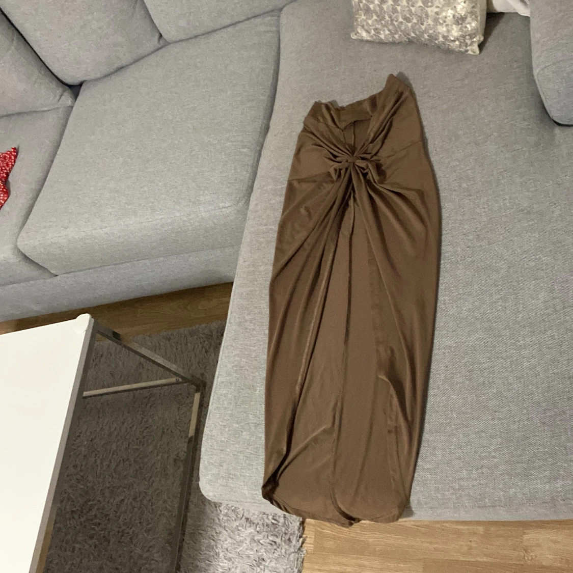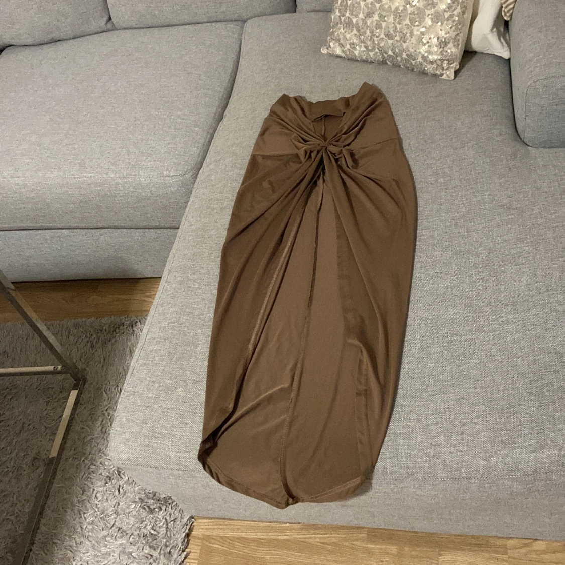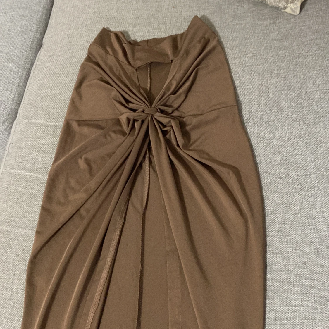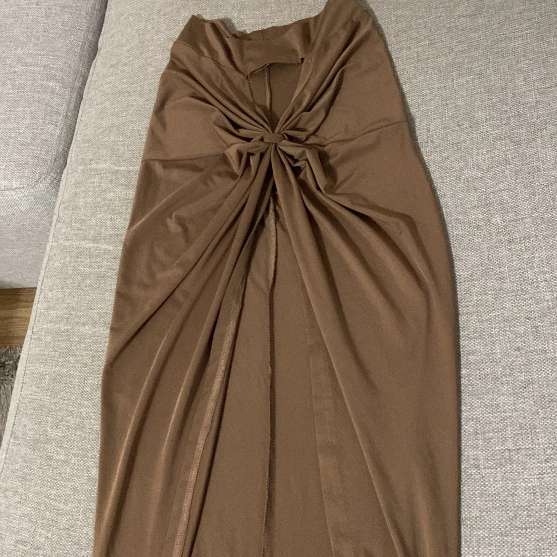 Brun kjol med en knutdetalj framtill och en slits. Brun kjol med en knutdetalj framtill och en slits.den har även en topp ska ta nya bilder snart.tror den är oanvänd. Jätte fin elegant mycket bra skick.storlek passar 36-38 stretch material .vet inte märke på den.