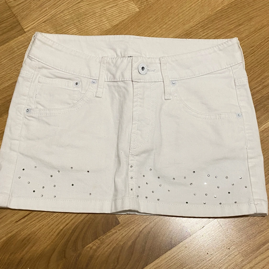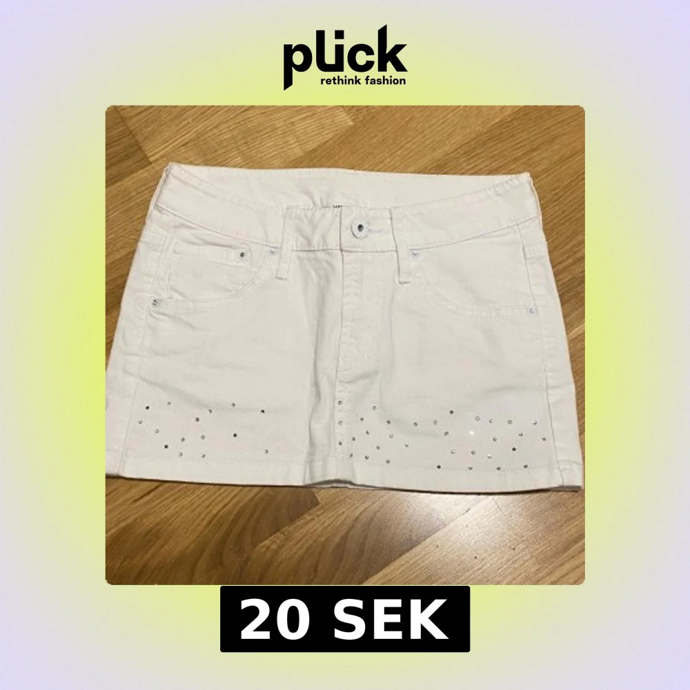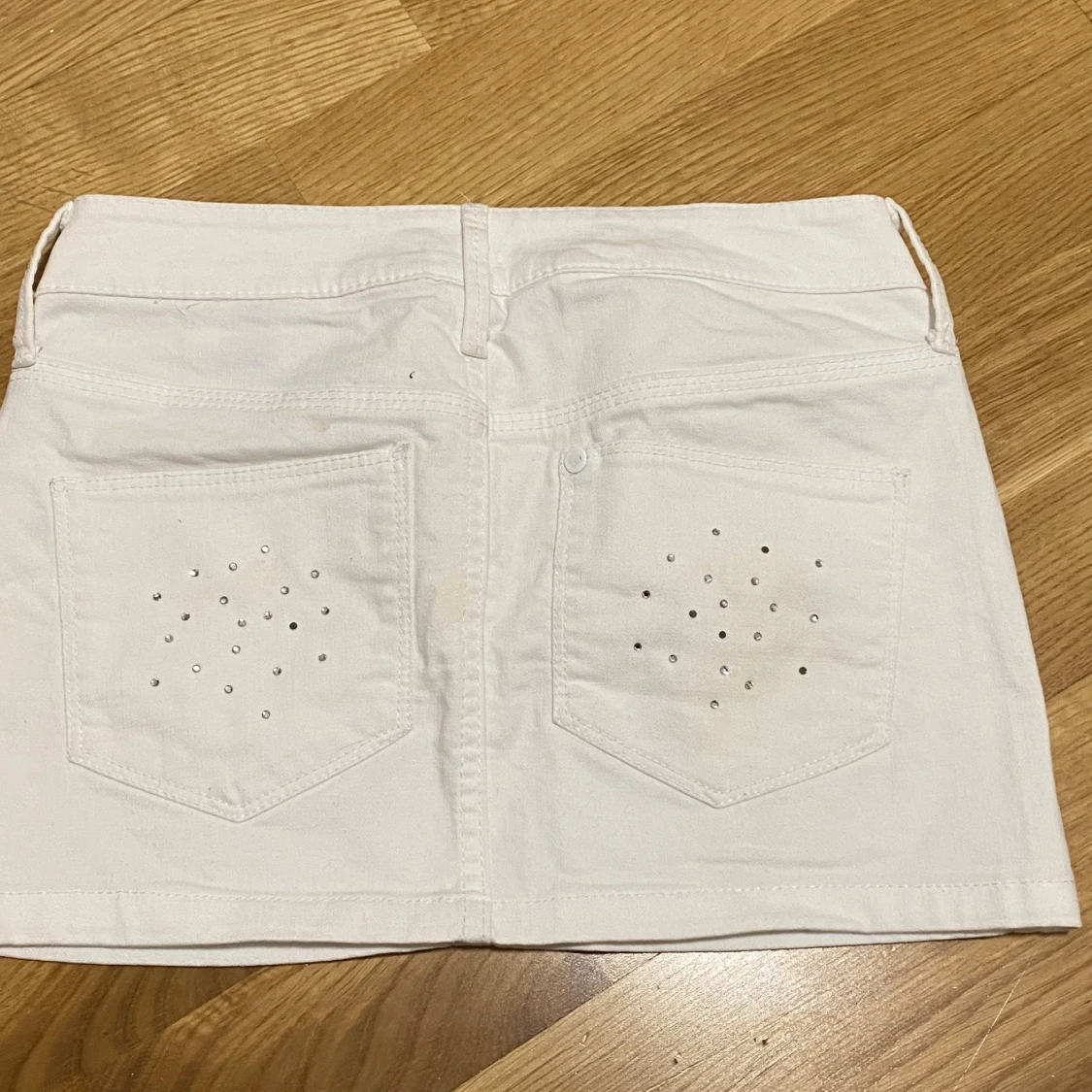 Vit jeanskjol från H&M med coola silvriga nitar framtill och på bakfickorna. Klassisk femficksmodell med bälteshällor och knappstängning. Perfekt för dig som gillar en clean men ändå glittrig look.