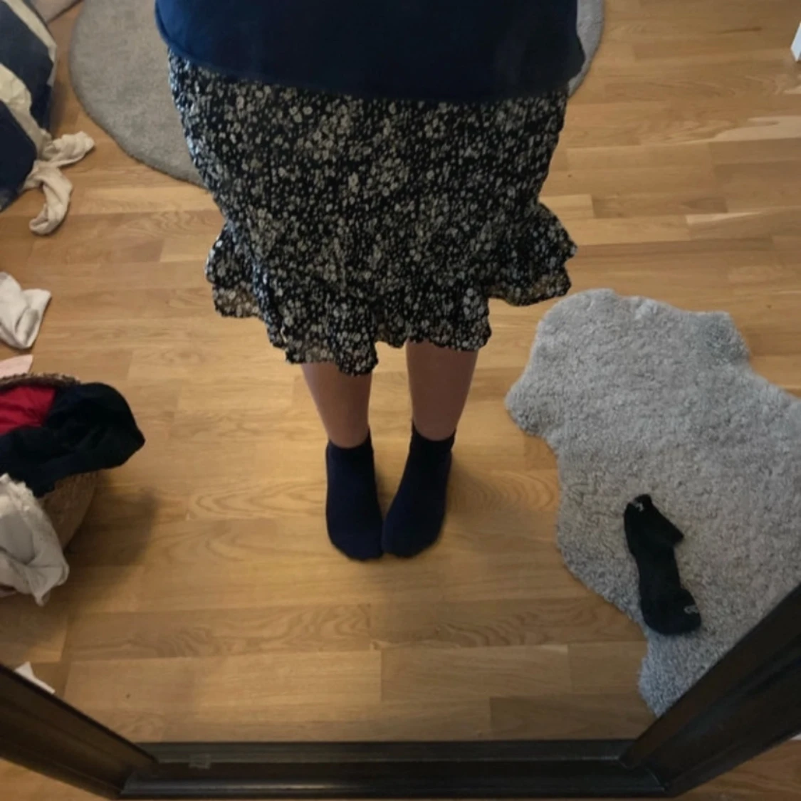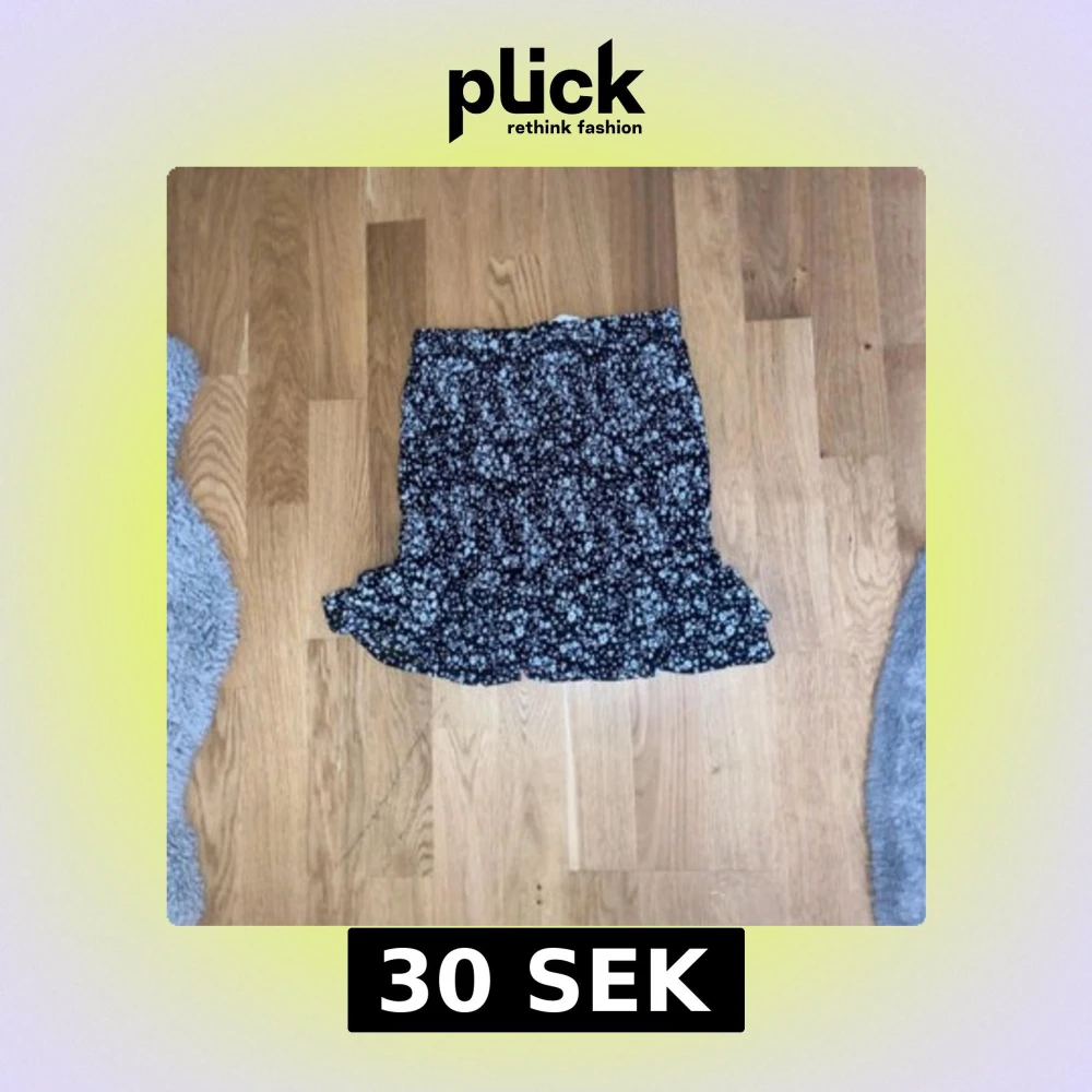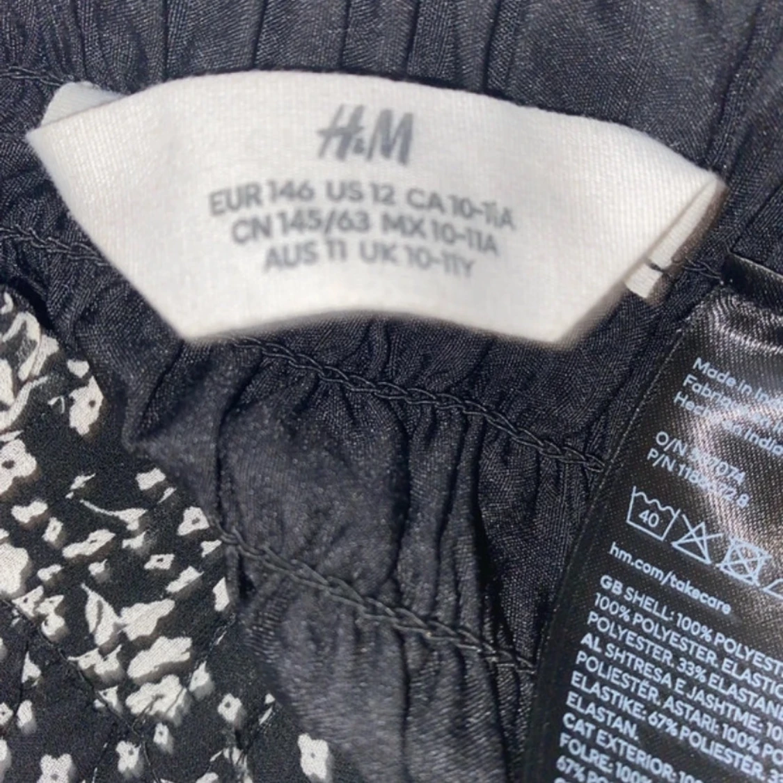 Supersöt svart kortkjol från H&M med vita små blommor och volang nertill. Kjolen har en bekväm resår i midjan och är gjord i lätt polyester, perfekt för en chill och trendig look.