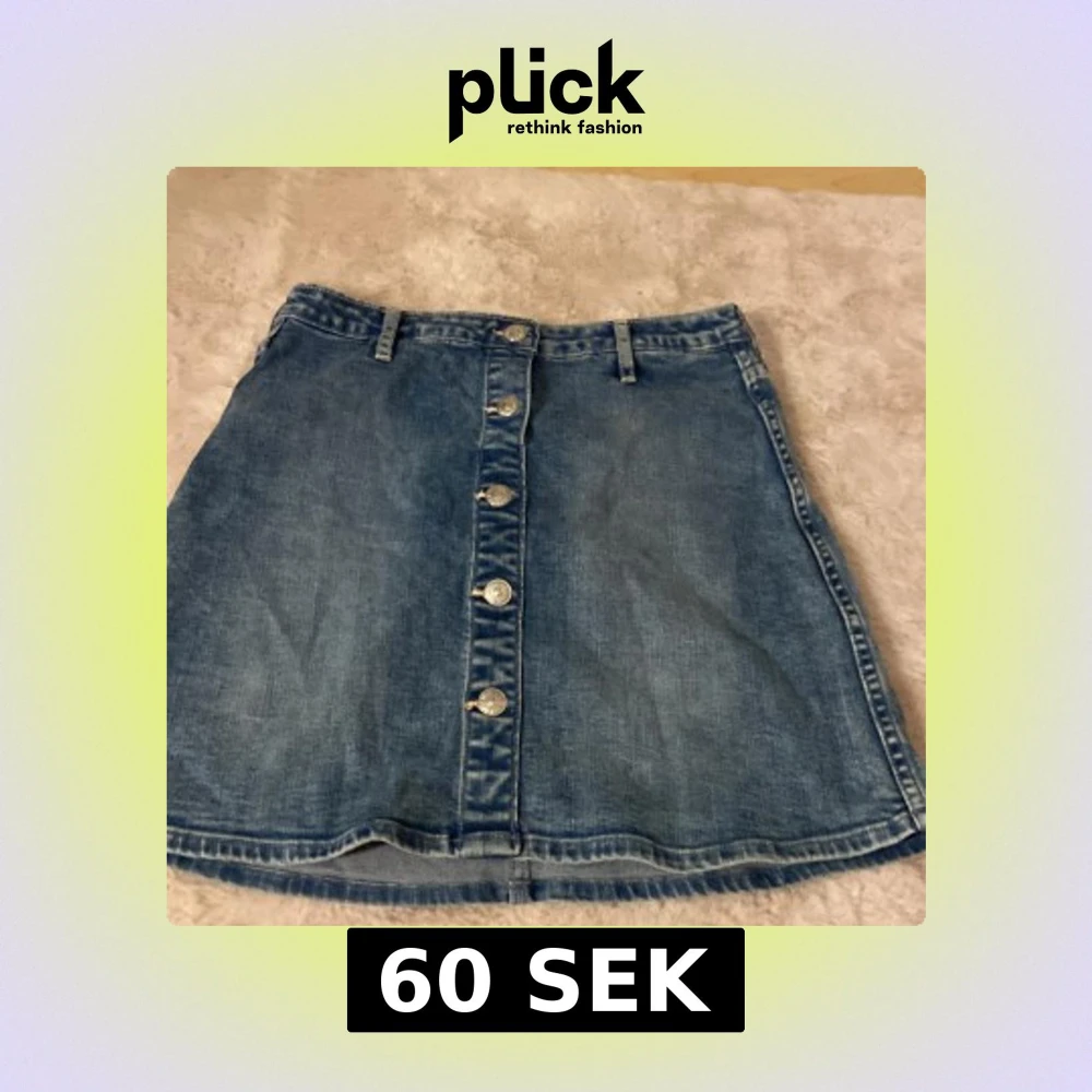 Snygg jeanskjol från H&M i klassisk blå denim. Kjolen är kort och har en rak passform med knappar framtill och hällor för bälte. Perfekt till sneakers eller boots för en chill look.