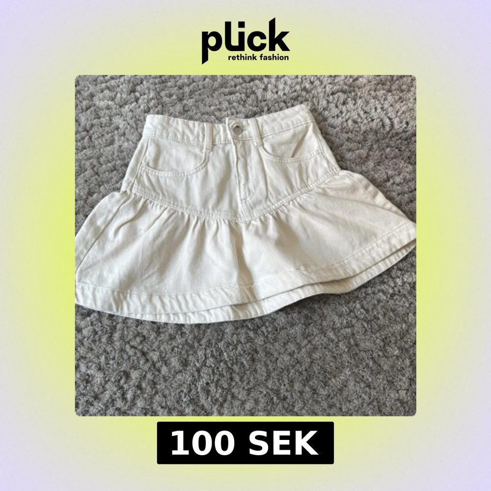 Supersöt vit kjol i jeansmaterial med volang nedtill och klassiska fickor fram. Kjolen har knapp och dragkedja i midjan och en lätt utsvängd form. Perfekt att styla med en enkel topp eller hoodie.