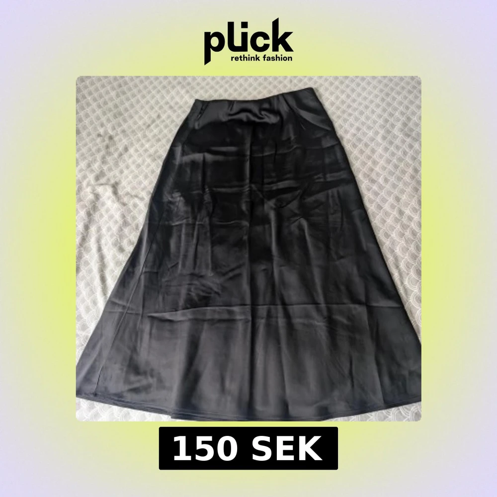 Stilren svart långkjol från HM i glansigt satinmaterial. Kjolen har en klassisk A-linjeform och slät midja för en snygg siluett. Perfekt för dig som gillar en enkel men elegant look.