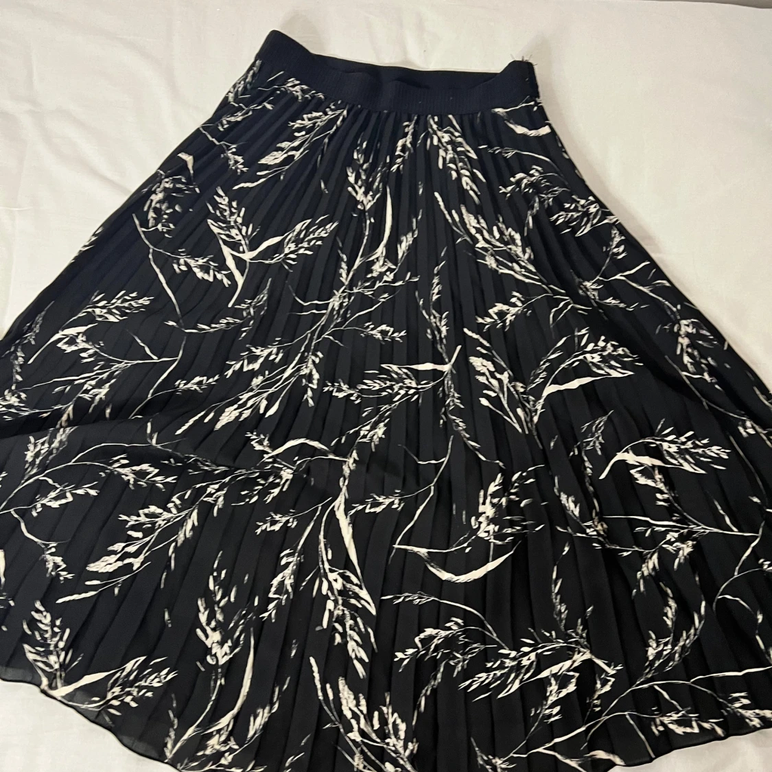 Säljer en superfin svart kjol med vita blommönster. Kjolen är plisserad och har en härlig flowy känsla, perfekt för både vardag och fest. Den är i mycket bra skick och passar perfekt till både sommar och vår. Kjolen är i en längre modell och har en elastisk midja för extra komfort.