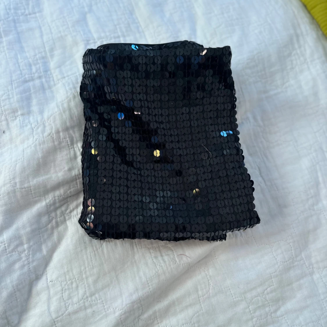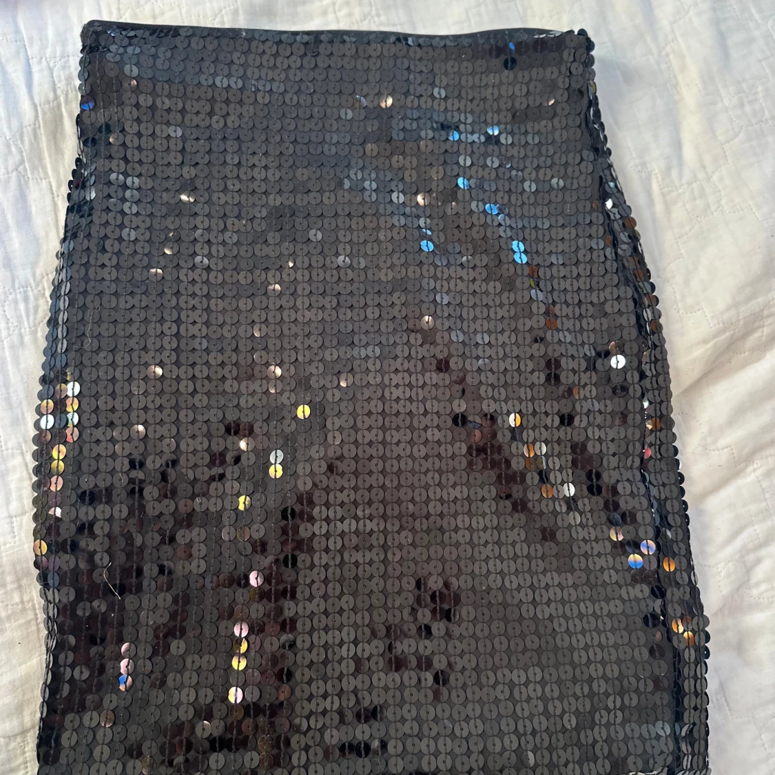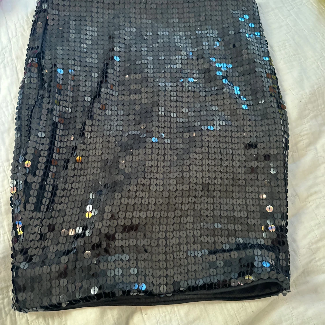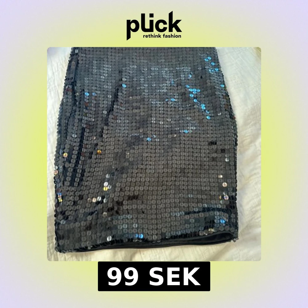Snygg svart kortkjol från H&M, täckt med glittriga paljetter som reflekterar ljuset. Kjolen har en rak och tight passform, perfekt för att sticka ut. Materialet är polyester med ett mjukt foder på insidan för extra komfort.