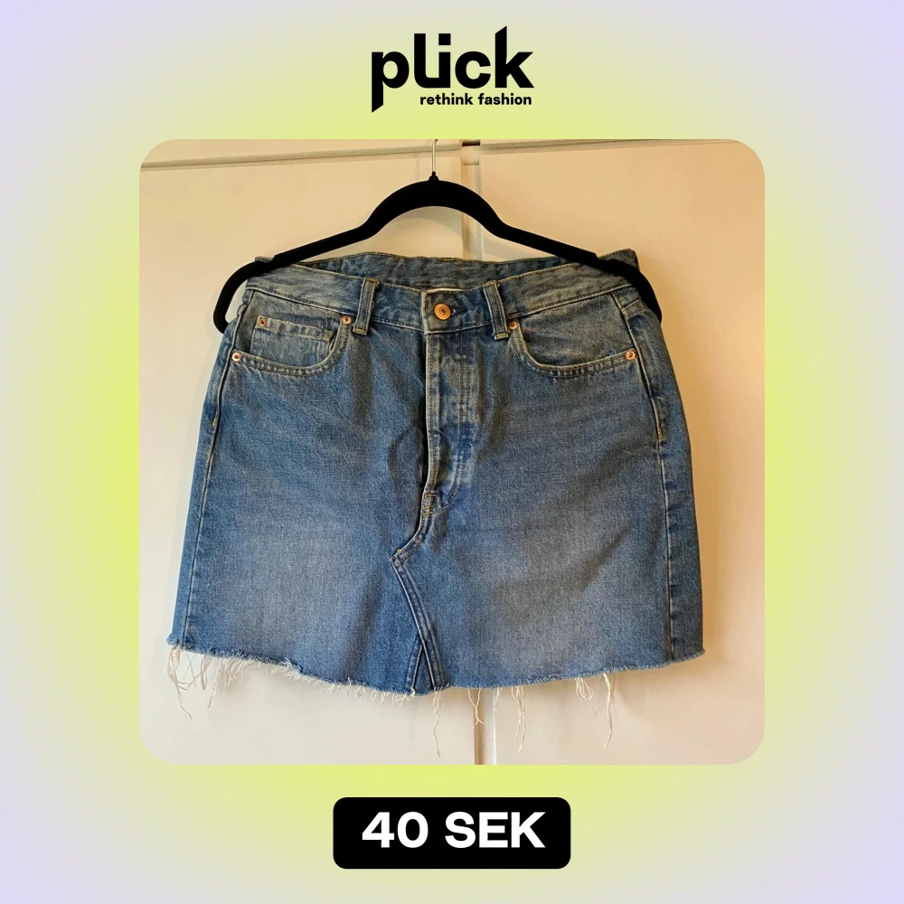 Säljer en cool blå jeanskjol med rå kant och klassisk femficksdesign. Perfekt för en avslappnad look! Kjolen har en knappar framtill.