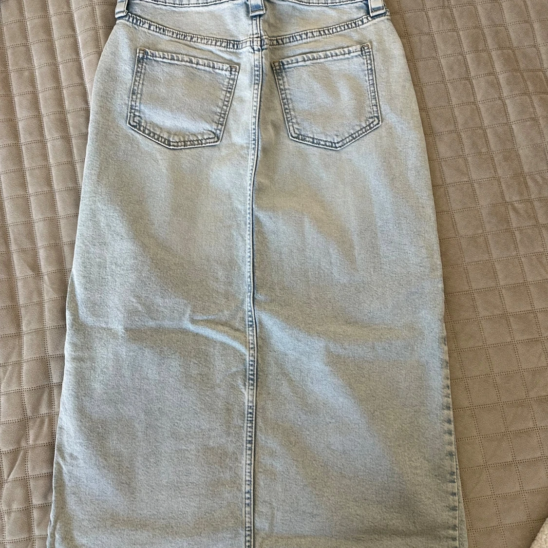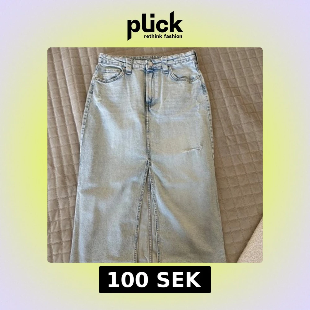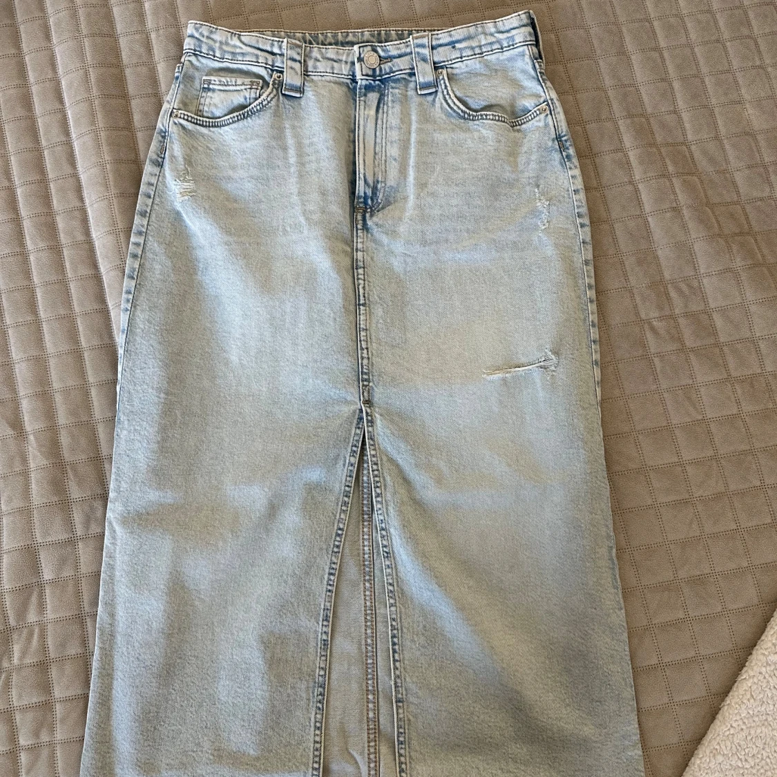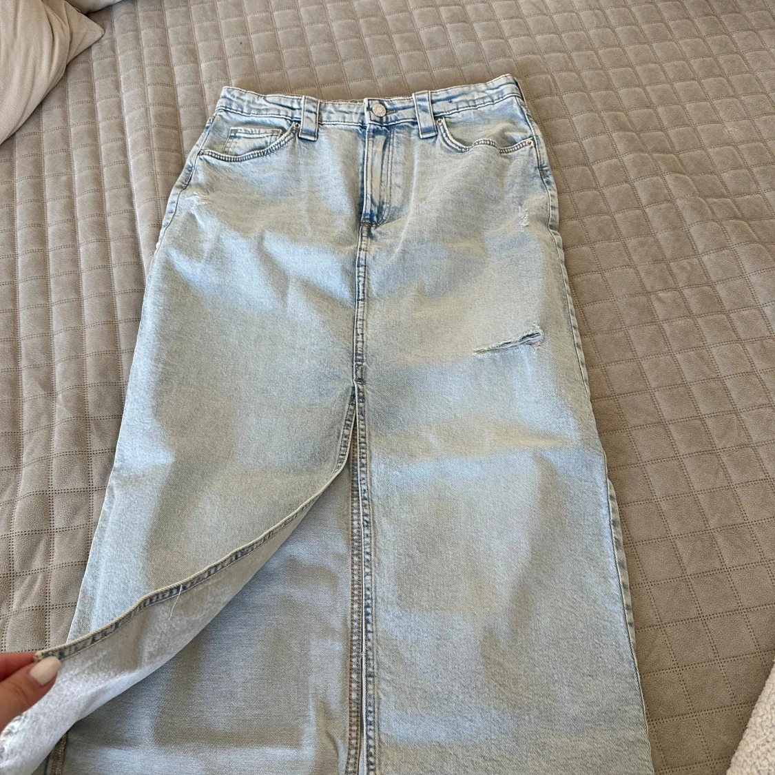 Lång jeanskjol från H&M i ljusblå denim med klassiska fickor fram och bak, slits framtill. Snygg, rak passform och diskreta slitningar för en cool look.