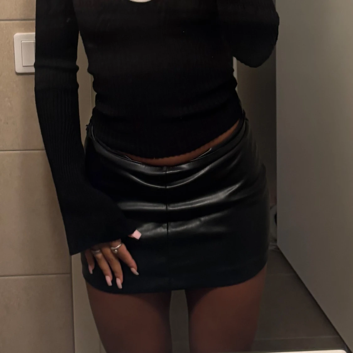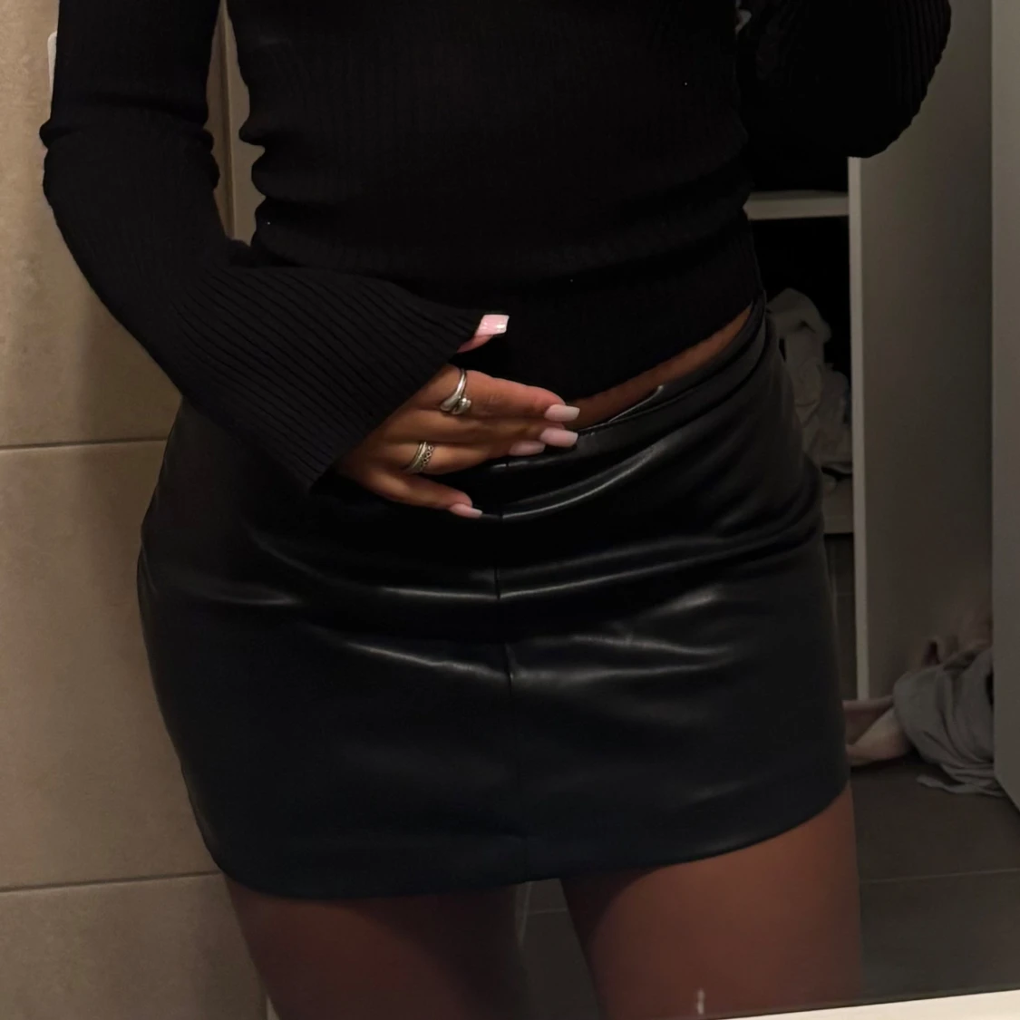 Säljer en svart, tight minikjol i skinnimitation. Kjolen har en slät yta och klassisk passform som sitter högt i midjan. 150 kr