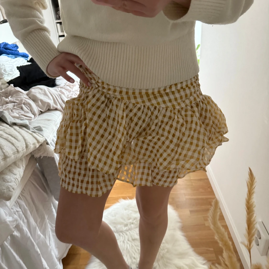 Supersöt kort kjol med gult och vitt rutigt mönster och volangdetaljer. Perfekt för dig som gillar en trendig stil. Kjolen har en luftig passform och är lätt att matcha med olika toppar.