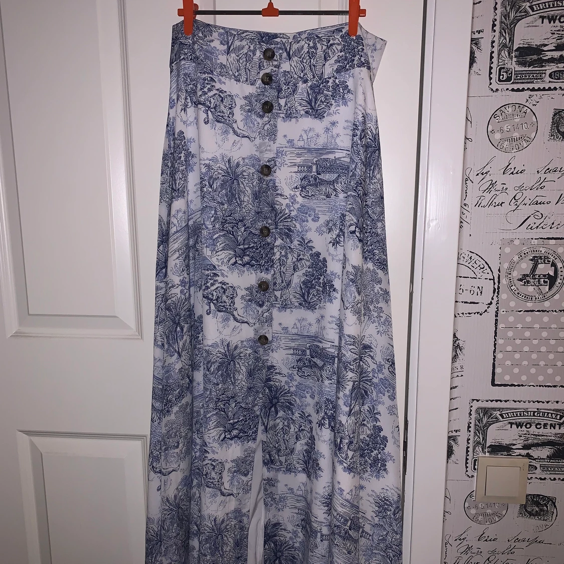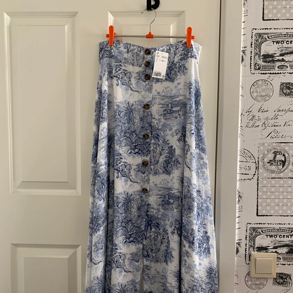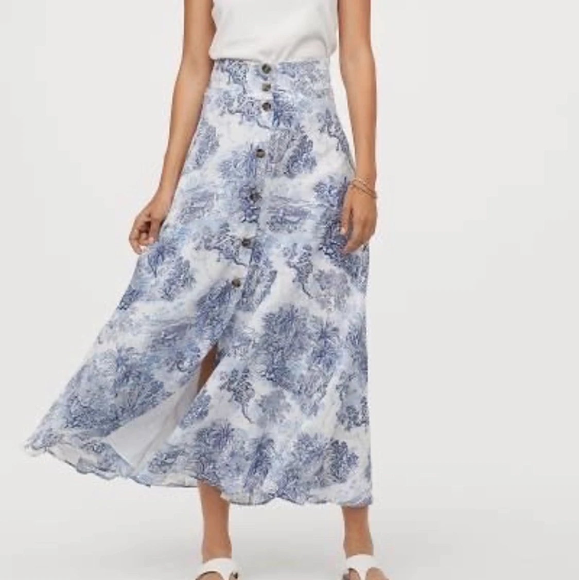 En mycket fin midi kjol från H&M som passar perfekt nu i sommar. Tyvärr är den i minsta laget för mig i midjan, skulle även säga att den är lite liten i storleken. Kan därför även passa en 36. Den är helt oanvänd och prislappen sitter kvar. Första bilden är lånad och kan skicka fler bilder vid intresse.