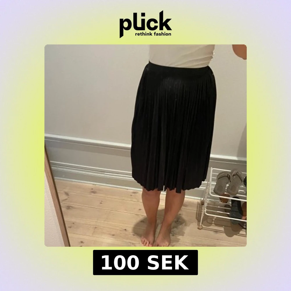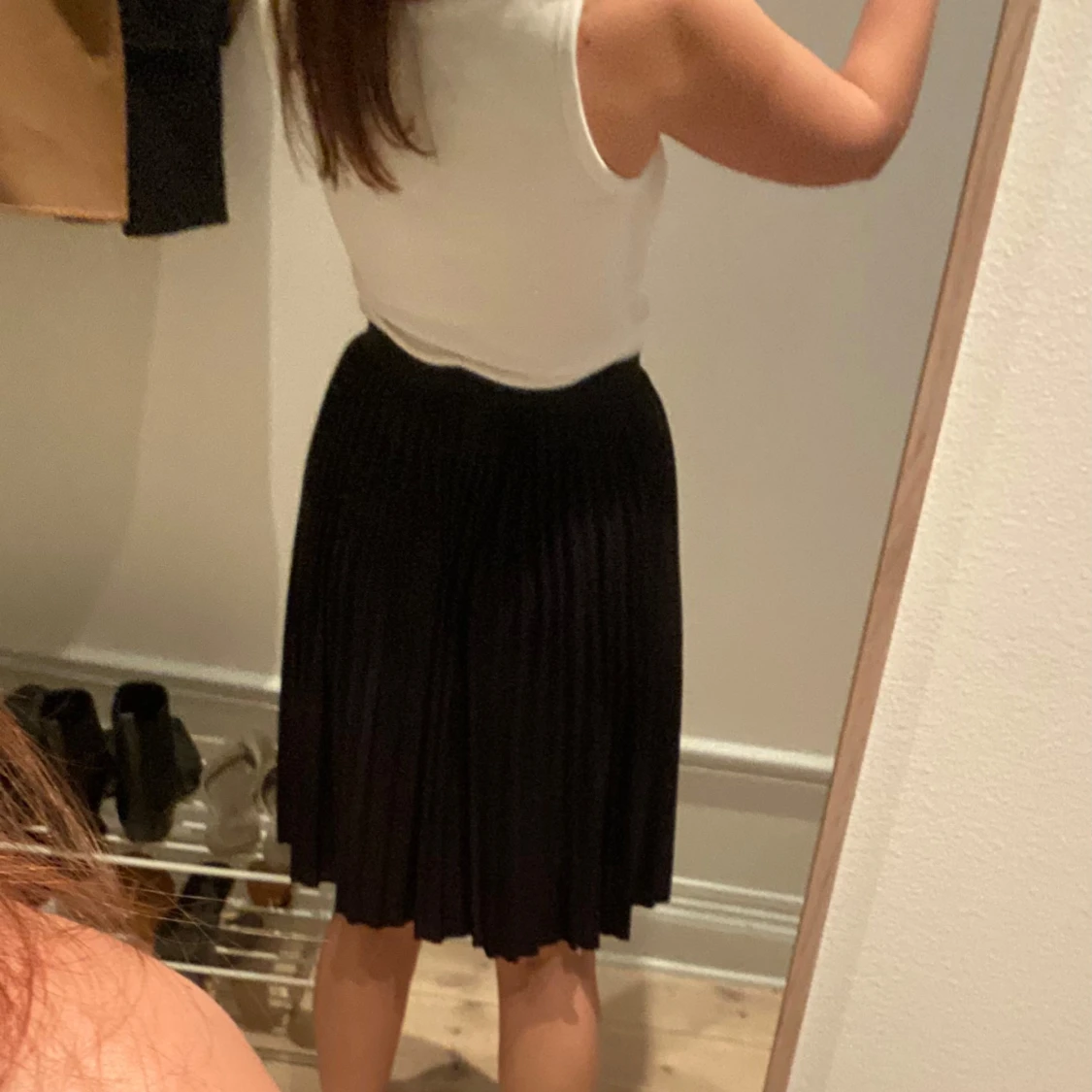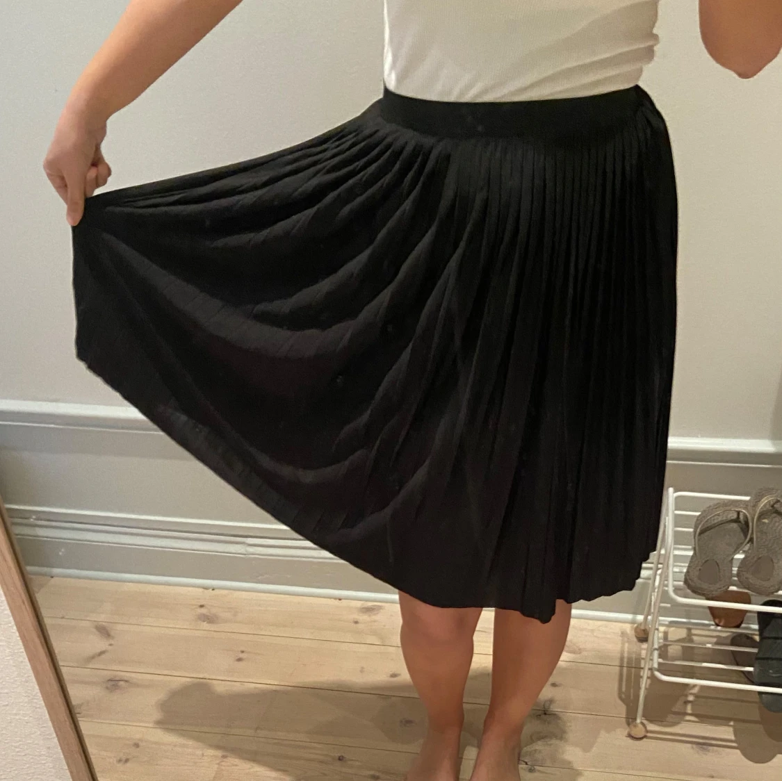Säljer en svart plisserad kjol med midjeresår. Kjolen har en klassisk A-linjeform och är knälång, vilket ger en snygg och tidlös look. Perfekt att styla med en enkel topp eller stickad tröja. Aldrig använd pga är ingen kjol-tjej