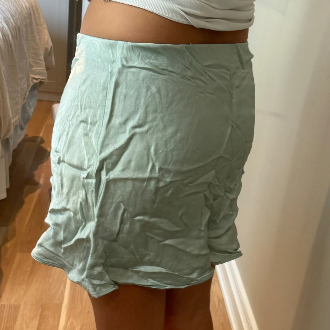 Säljer en ljusgrön kortkjol från H&M i glansigt satinliknande material. Kjolen har en enkel och stilren design med rak passform och resår i midjan. Perfekt att styla med en crop top eller stickad tröja för en fräsch look.