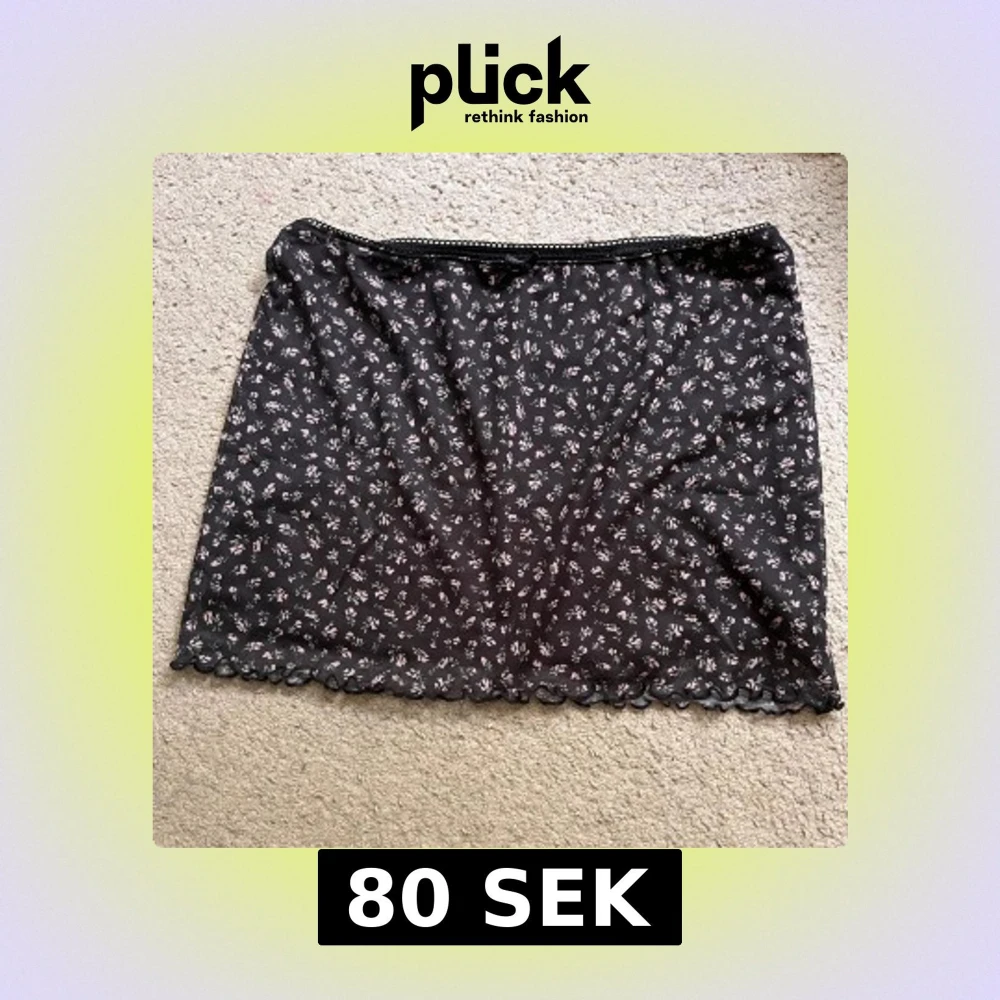 Supersöt svart kortkjol med små blommor i ljusrosa och vit. Kjolen har en fin spetskant nertill och en smal spetsdetalj upptill i midjan. Funkar som top också! Aldrig använd