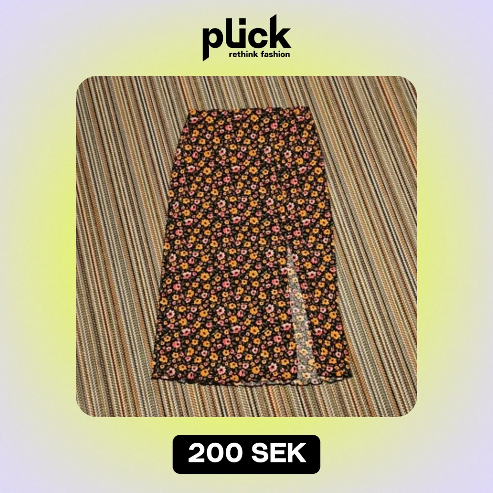 En blommig midikjol. Den har ett slit på ena sidan så benet syns. Kjolen är storlek s men jag är storlek m vanligtvis. Så ha det i åtanke.