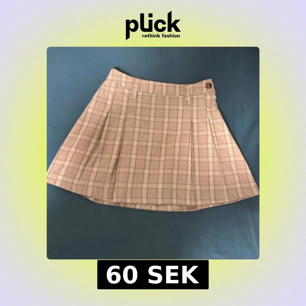 Beige kortkjol med rutigt mönster och snygga veck och en knapp i midjan