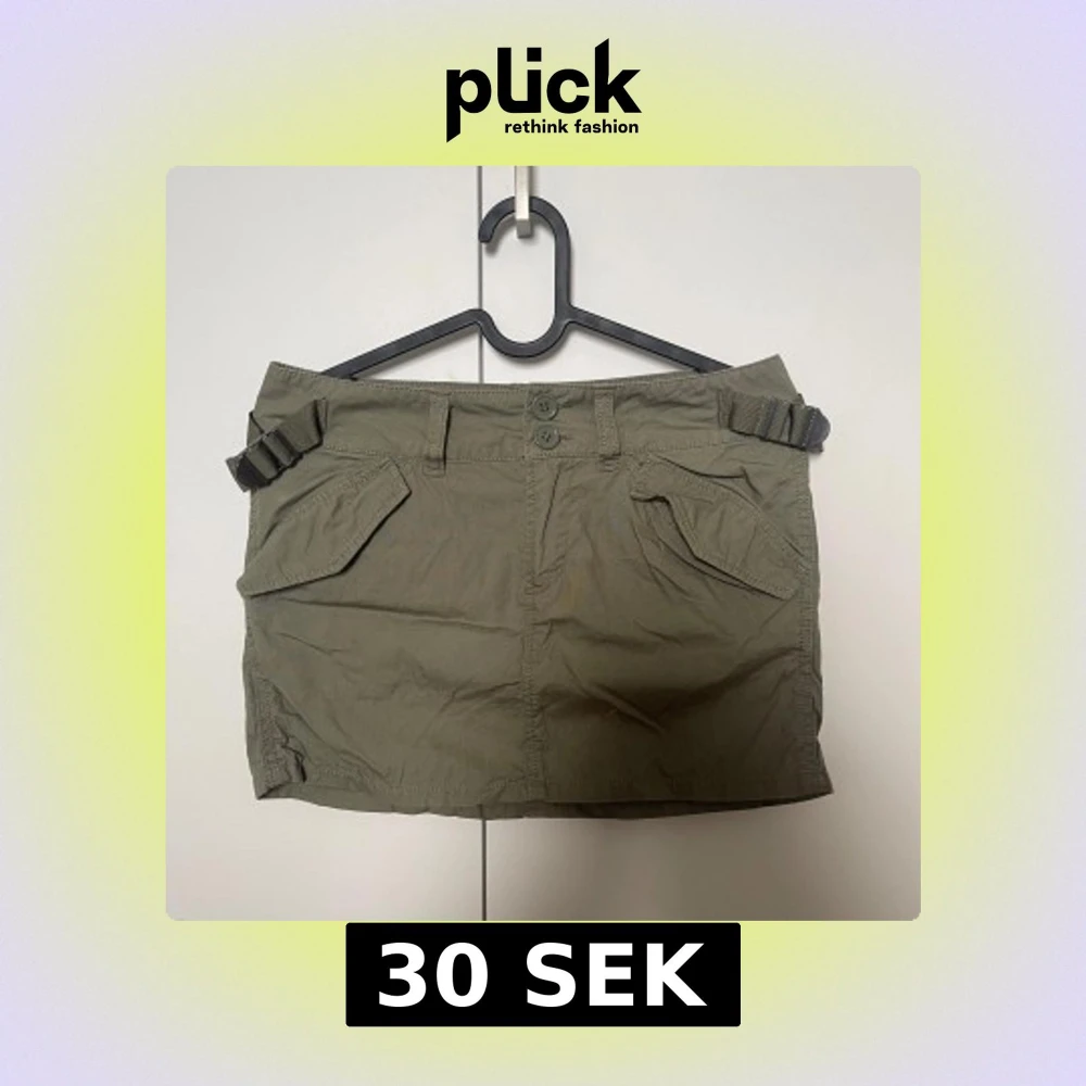 Snygg olivgrön utility-inspirerad kortkjol, dubbla knappar och spänndetaljer i midjan. Lågmidjad