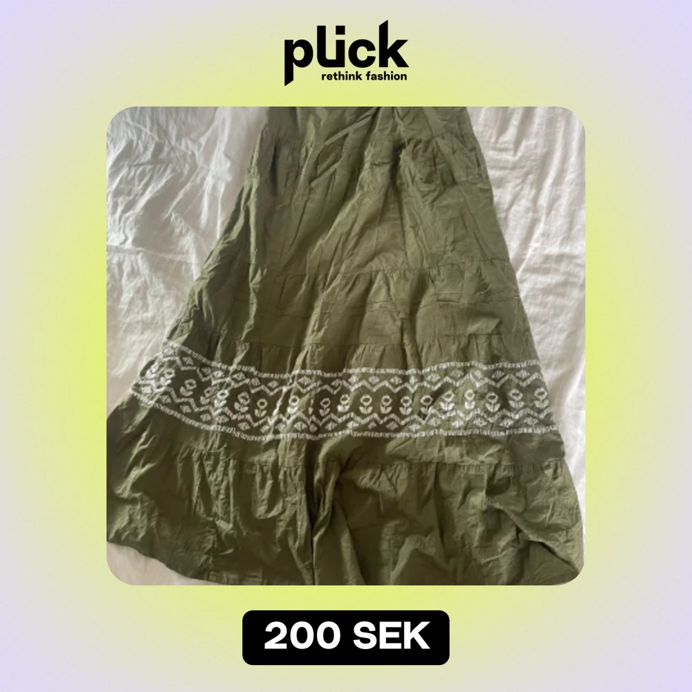Säljer en superfin grön långkjol med en vacker vit broderad detalj runt nederdelen. Den är perfekt för sommaren och är superbekväm att bära. Materialet känns lätt och luftigt, bra för varma dagar. Den är i nyskick och redo att bli en del av din garderob! Kjolen kan även användas som en klänning då man knyter bandet bakom nacken båda har funkat lika bra💖