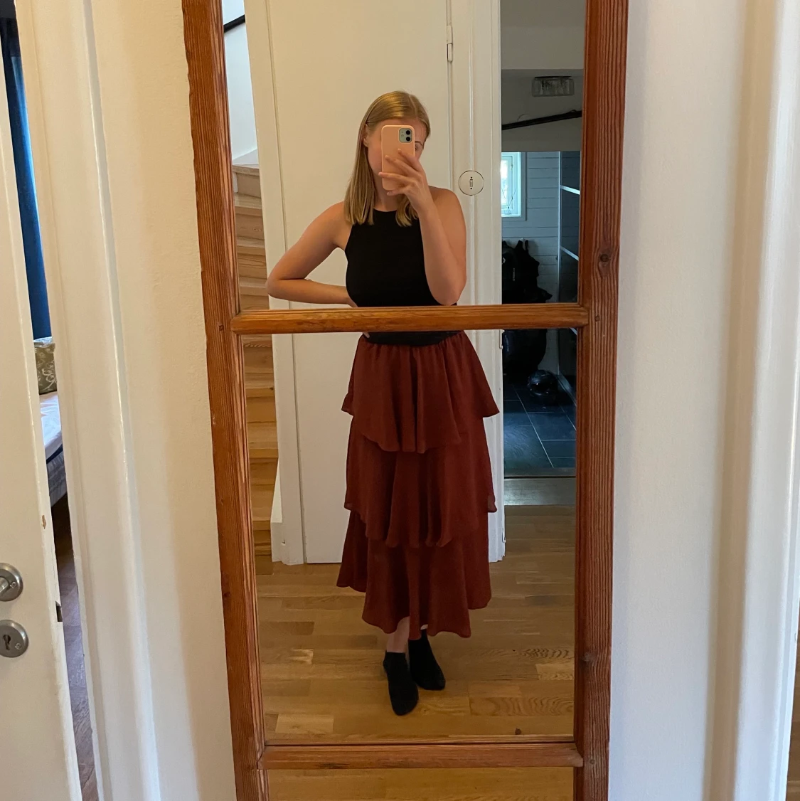 Fin kjol med volanger från Gina. Skulle säga att färgen är lite brunaktig, mer som på sista bilden men med lite vinrött i sig. Jättefin färg nu till hösten! Använd ca 3 gånger.