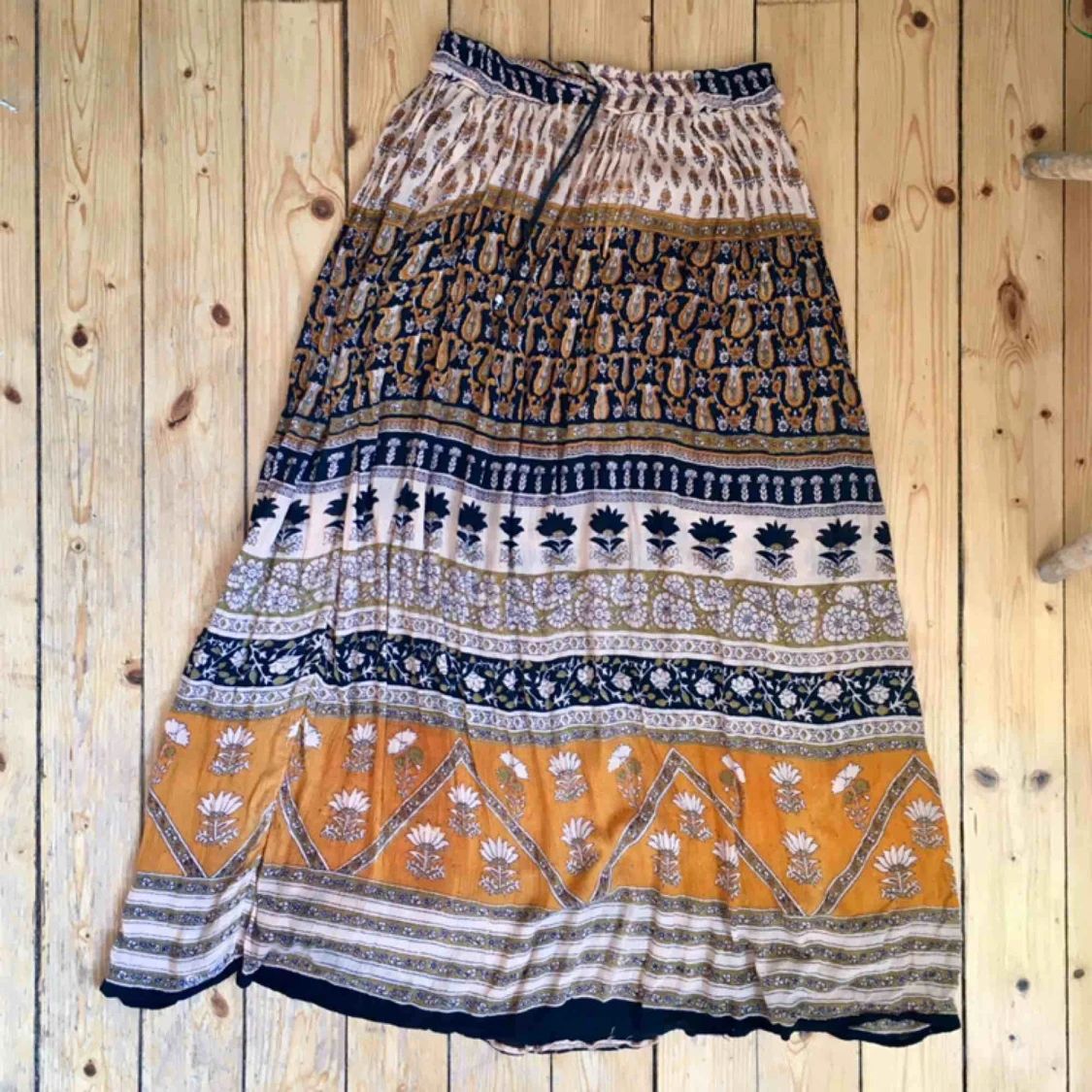 Fantastisk långkjol i bohemiskt tyg. Resår i midjan och svalt tyg. Köpt i Indien och i bra skick.