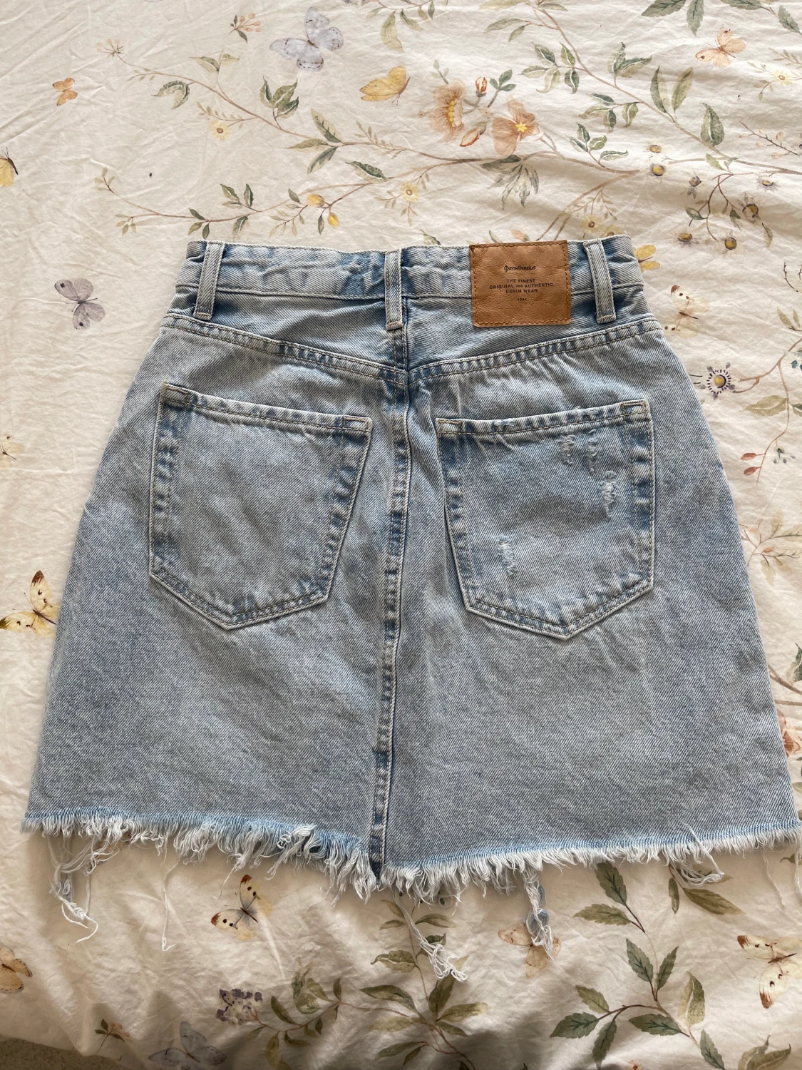 Snygg jeanskjol från spanska märket stradivarius. Ganska sparsamt använd så i bra skick! Pris är exklusive frakt