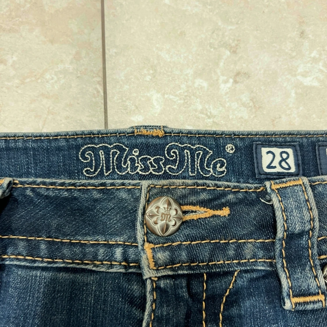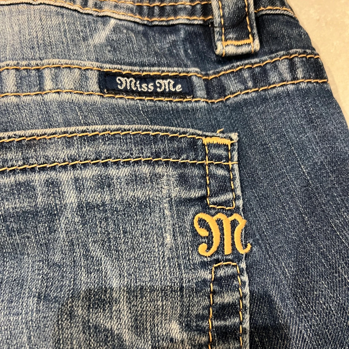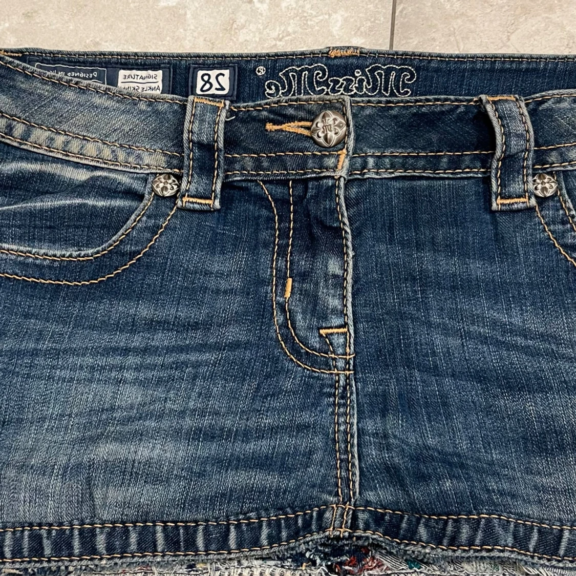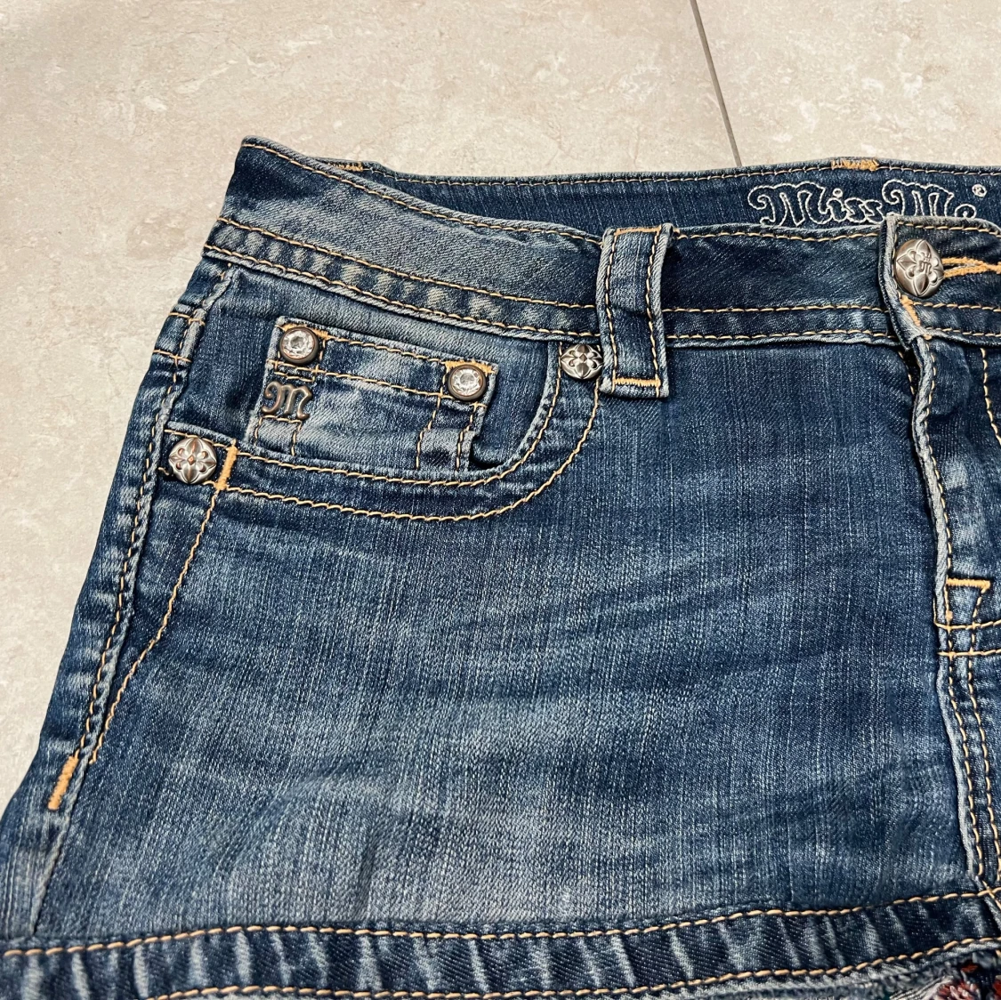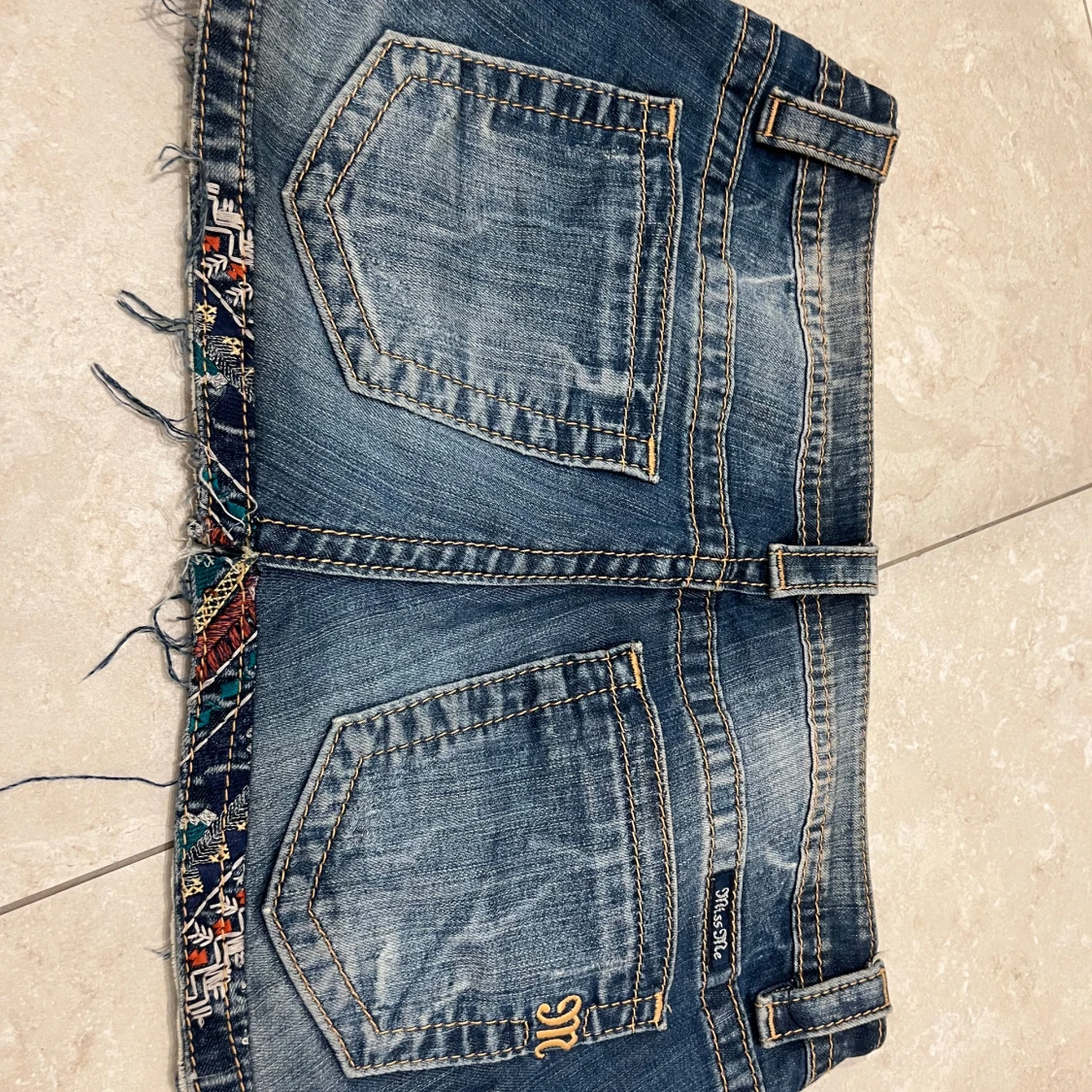 Jätte fin jeans kjol från miss me, storlek w28 skulle säga att den passar från w27-30. Lite sliten längst ner som man ser på sista bilden och det är själva modellen och det ska vara så.