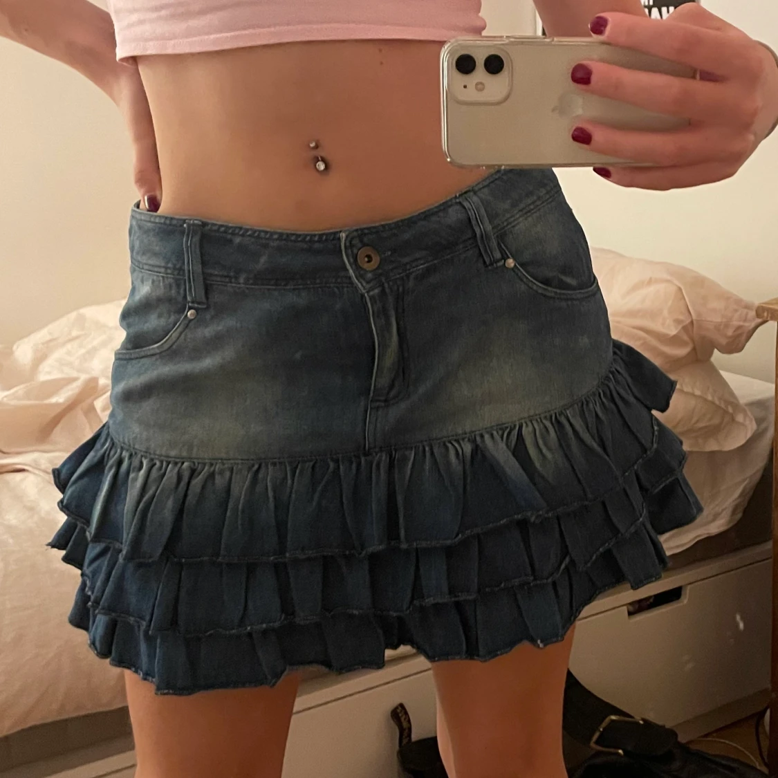 Supersöt jeanskjol med volanger som jag köpt second hand men tyvärr ej fått användning av. Storlek s, jag är 165 cm för referens. Kan mötas i Stockholm annars betalar köpare frakt.