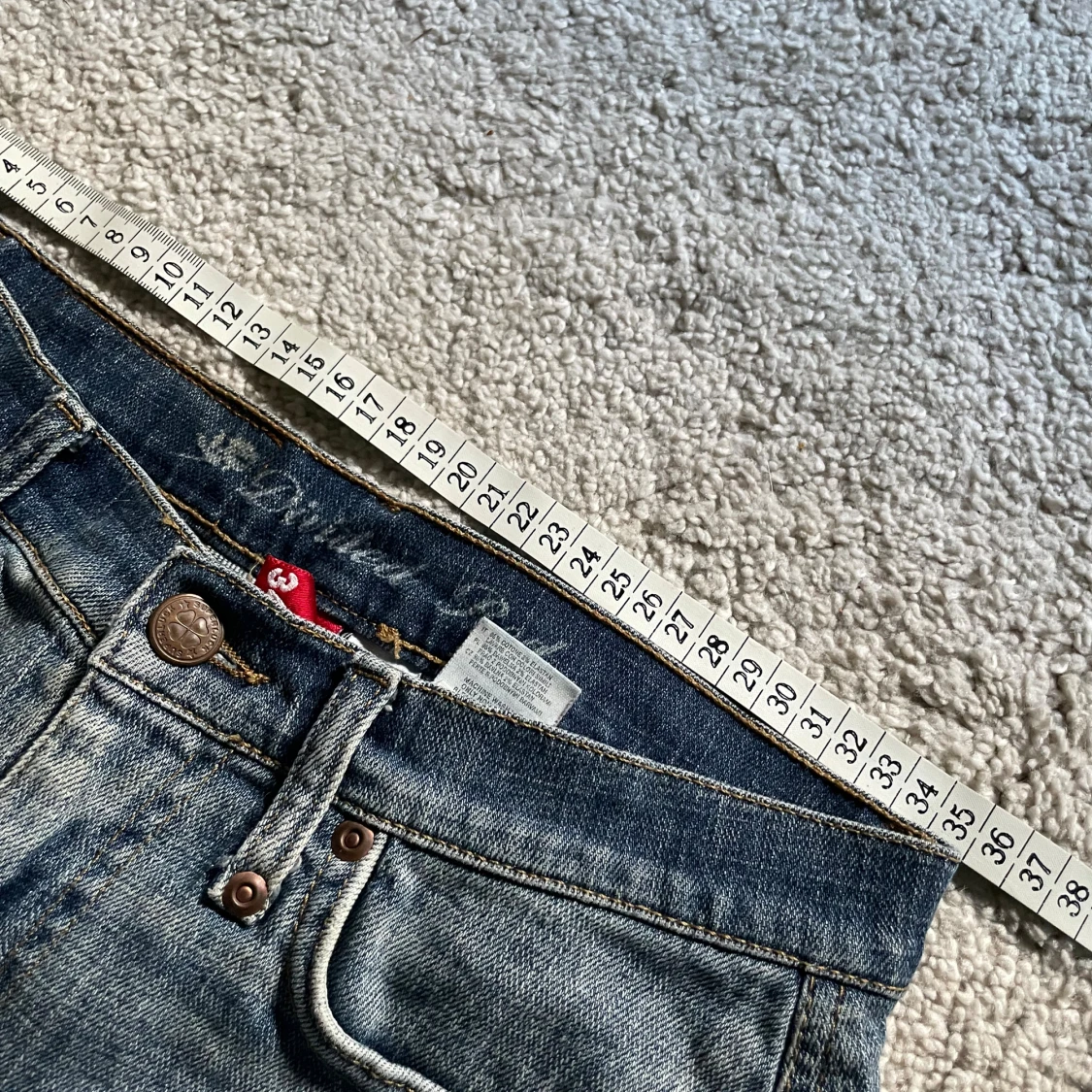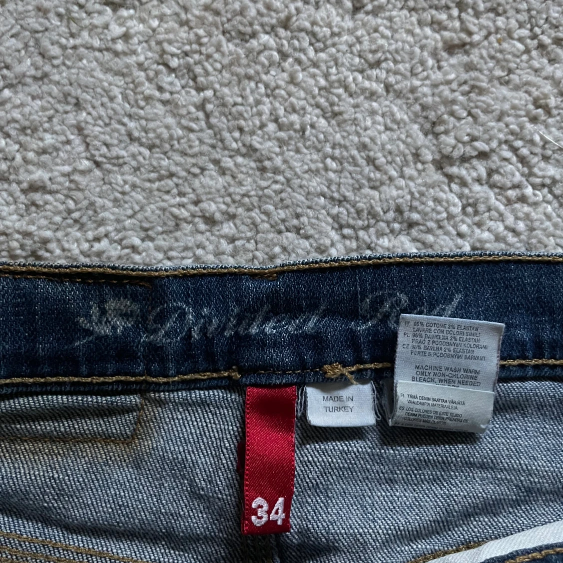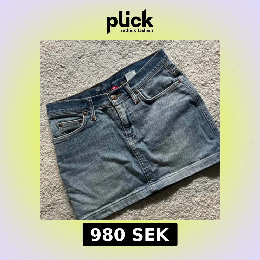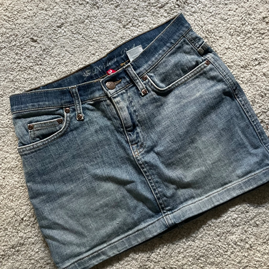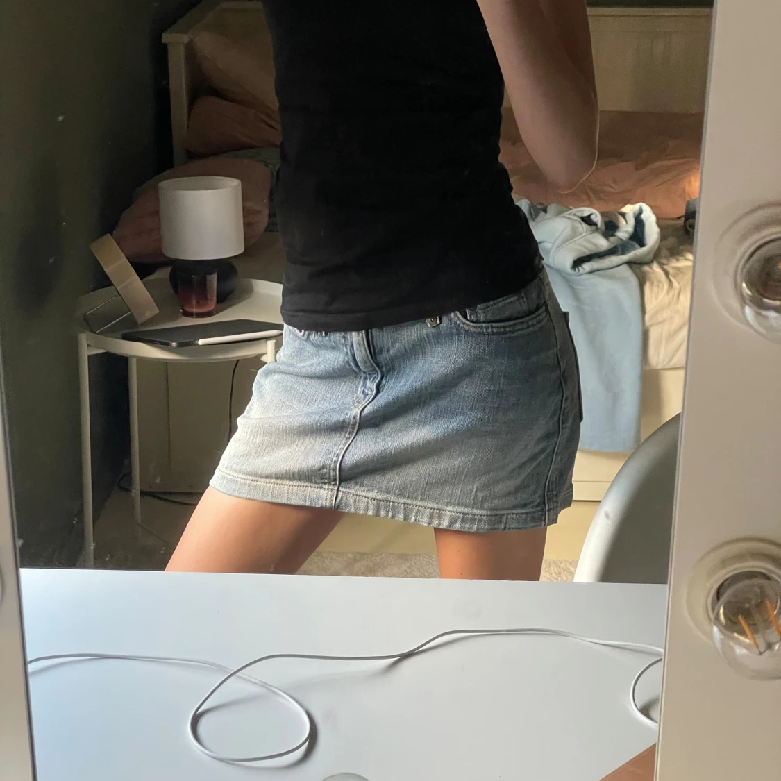 Säljer en klassisk blå jeanskjol med snygga guldiga broderier på bakfickorna. Kjolen är kort, har fickor och stängs med knapp och dragkedja.