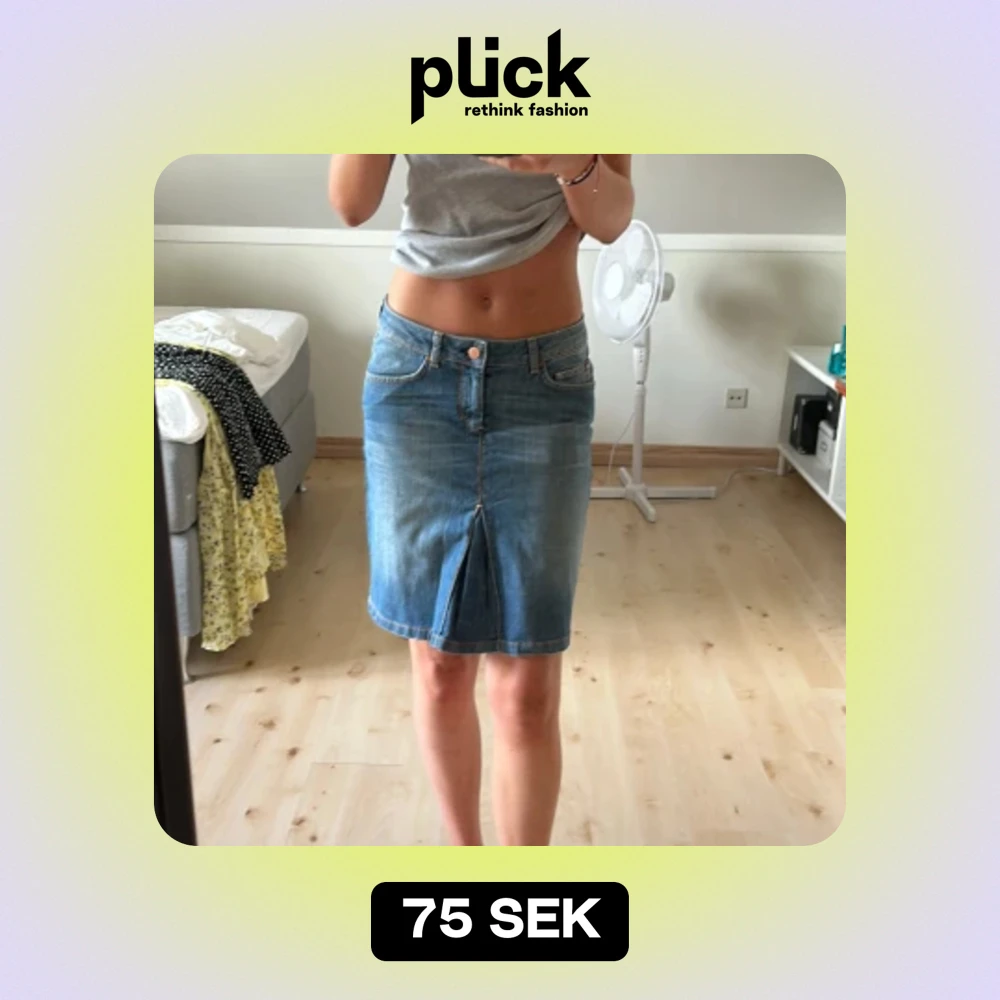 Jeanskjol från Zara. Äldre modell, 00-tal, lågmidjad. Slutar på låren. Bra skick.