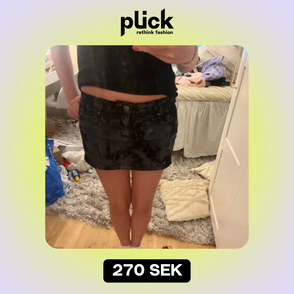 Så snygg lågmidjad jeans kjol. Med coolt mönster. Midjemått 36 cm och längd 27 cm