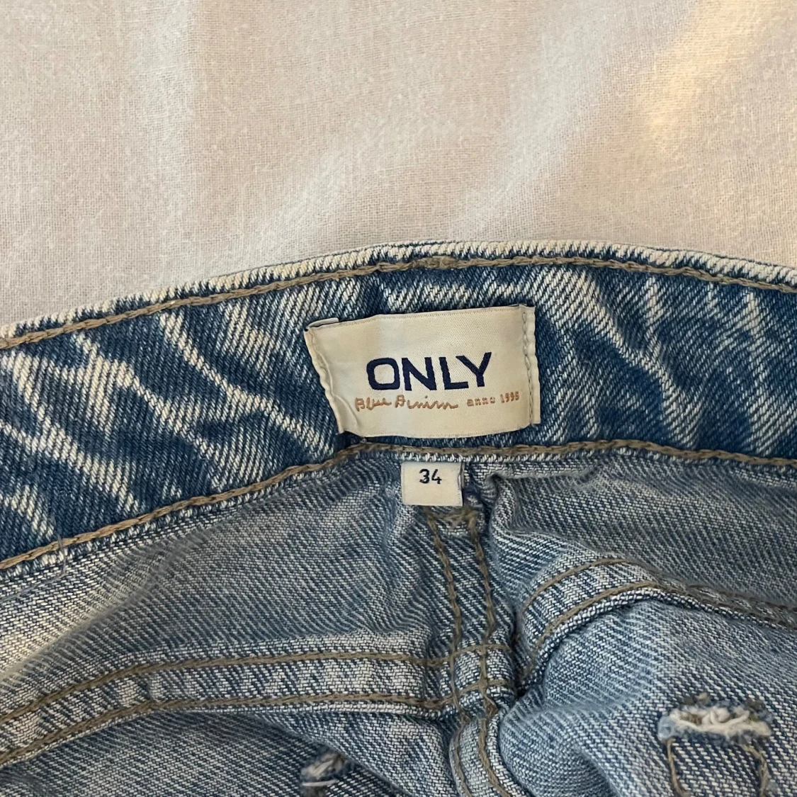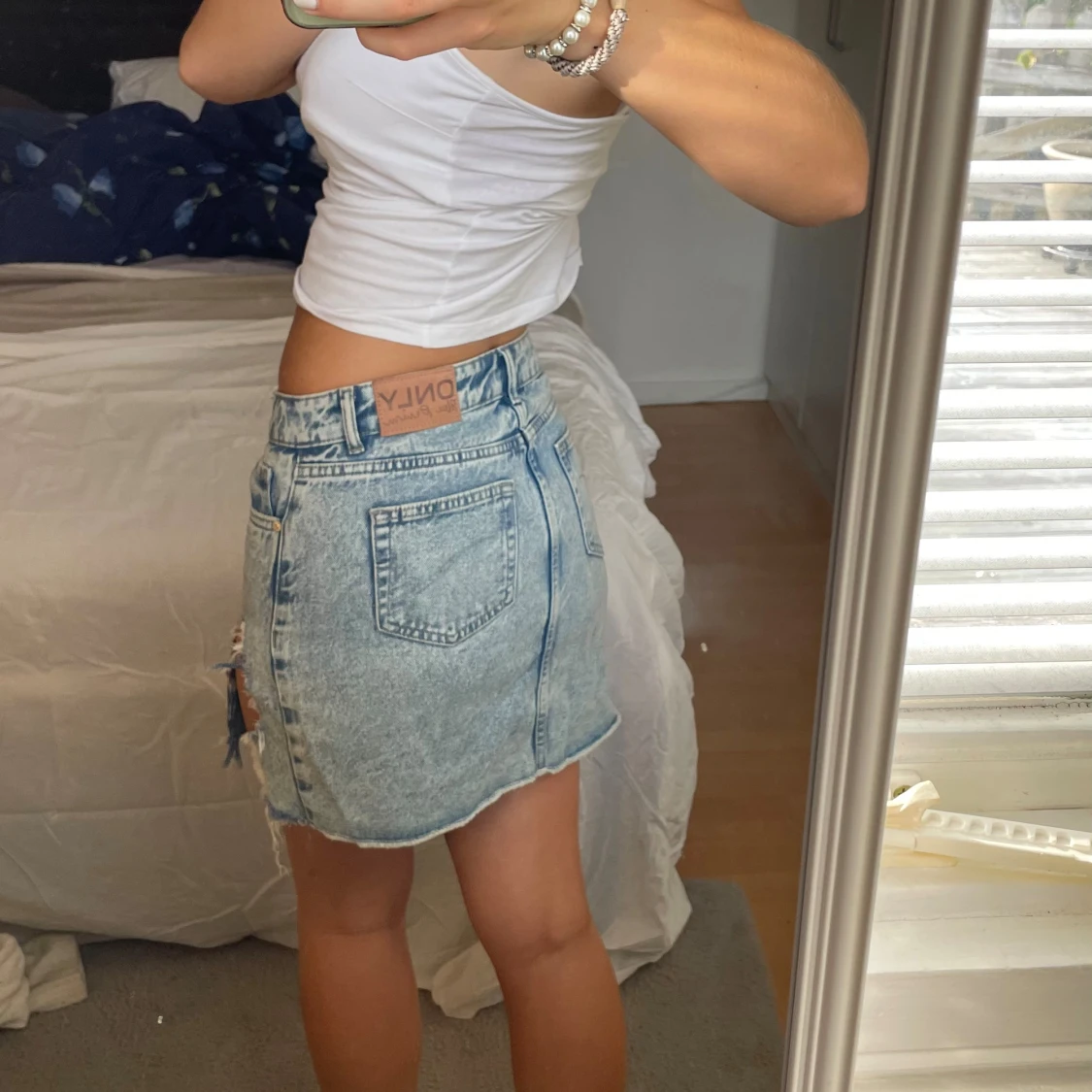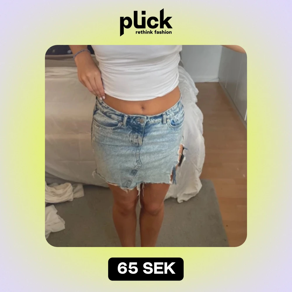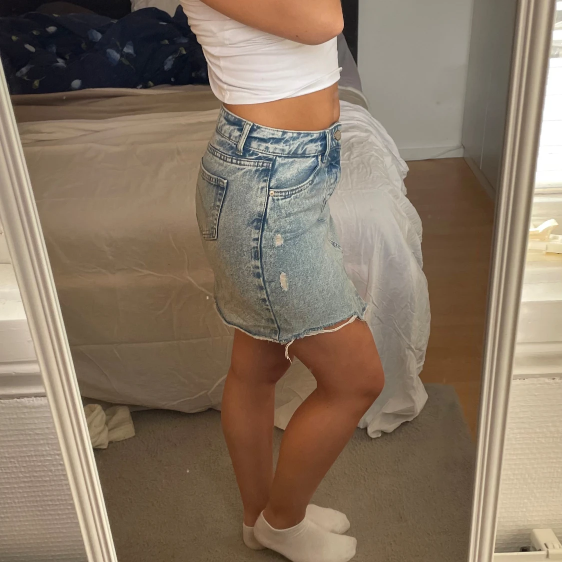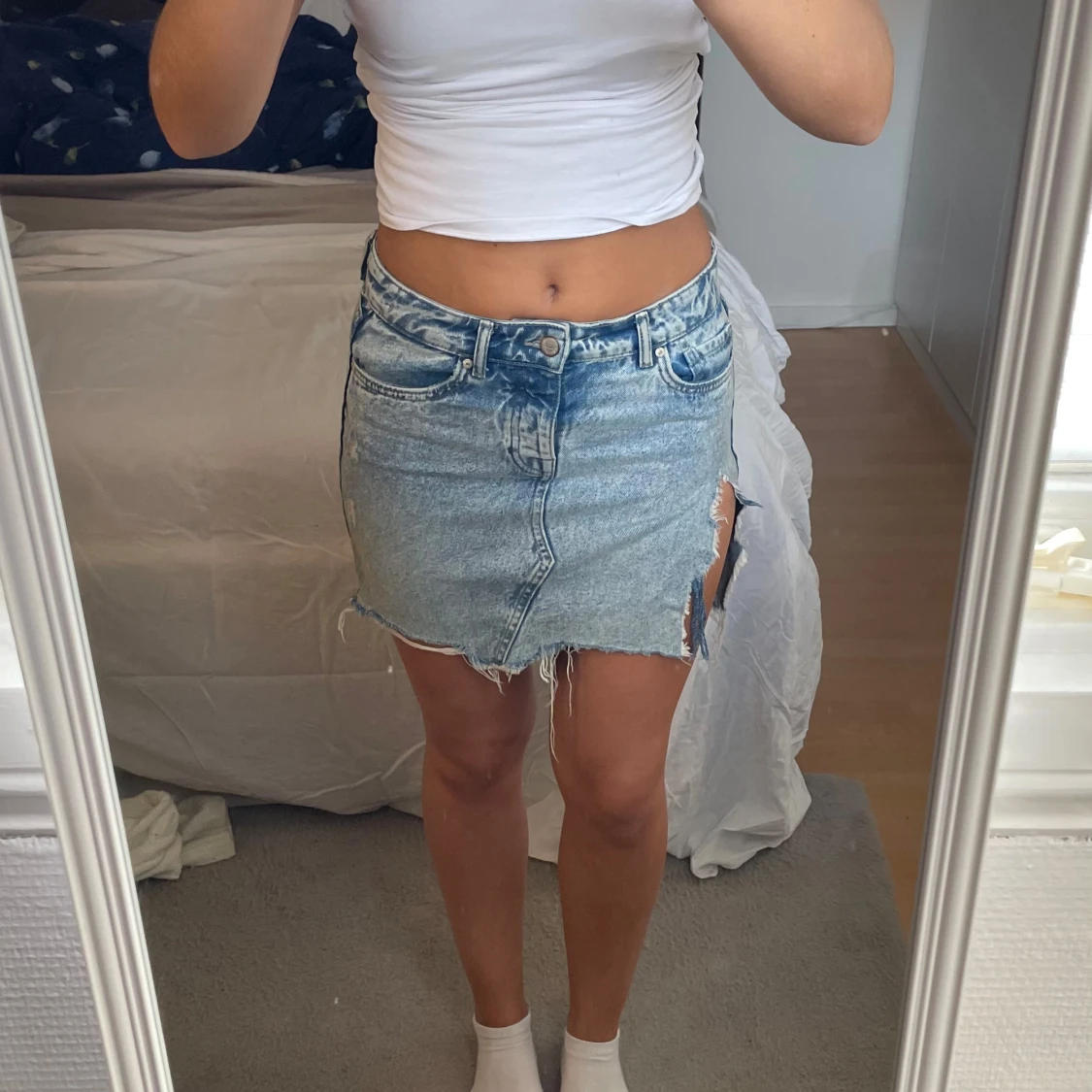 Jeanskjol från nelly i storlek 34/XS. Liten reva vid benet men jag tycker att det är en snygg detalj