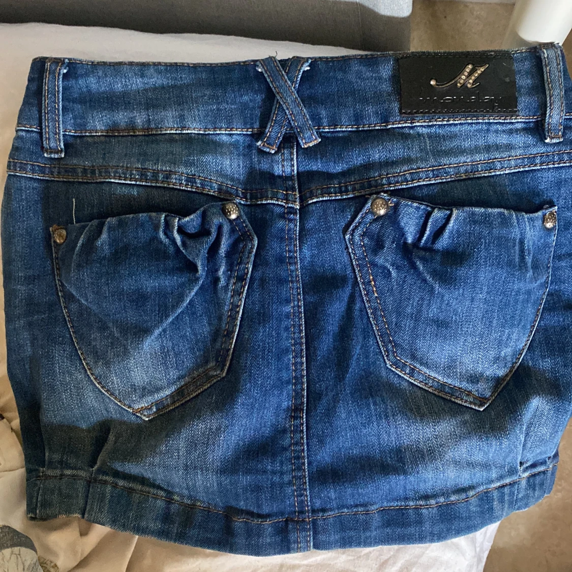 gullig lågmidjad jeanskjol i nyskick. det står att den är i storlek 36 men skulle säga att den är lite mindre än så💗