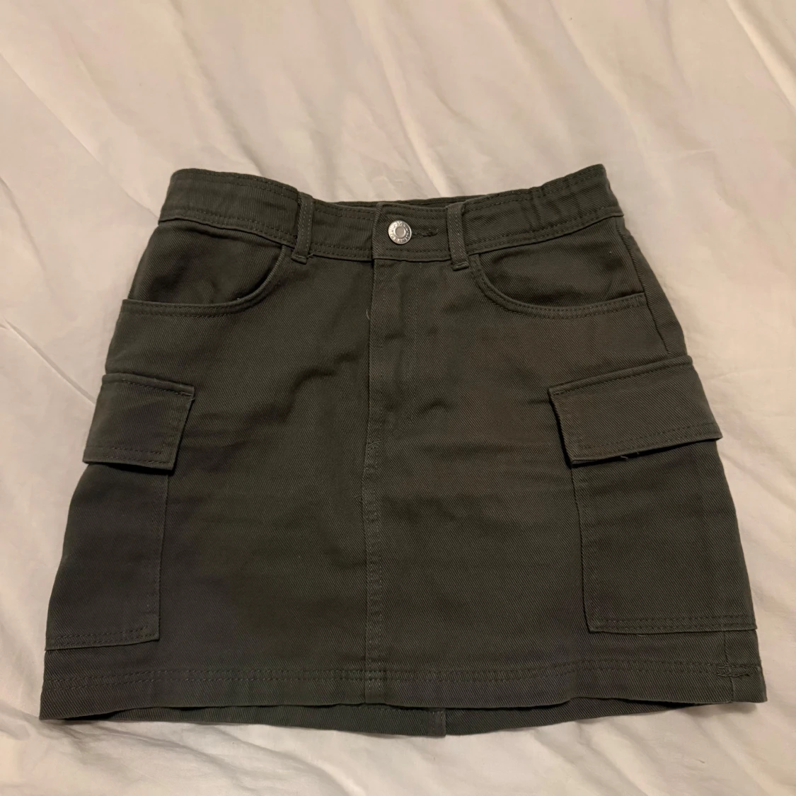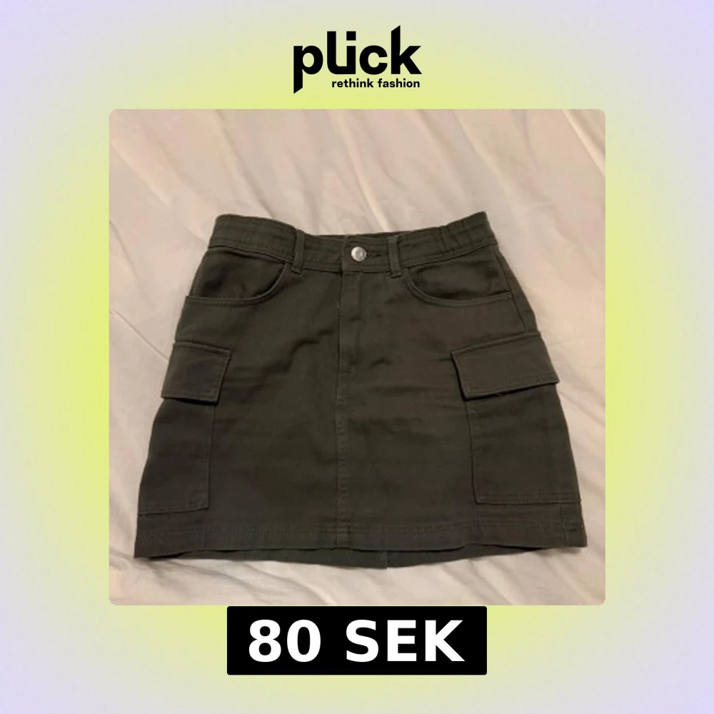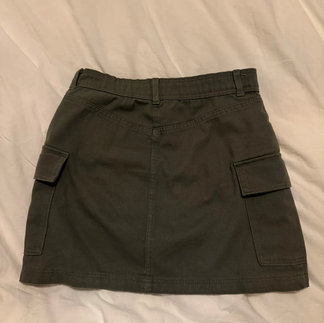 Grön jeanskjol med fickor framtill. Färgen är lite mer grön i verkligheten. Endast använd någon gång. Storlek 146 men passar mig som brukar ha xxs-xs