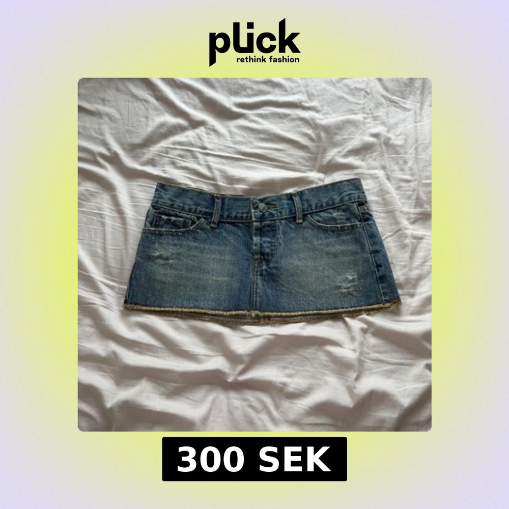 Trendig lågmidjad jeanskjol i blå denim med slitna detaljer. Står att de är storlek L men sitter som en s