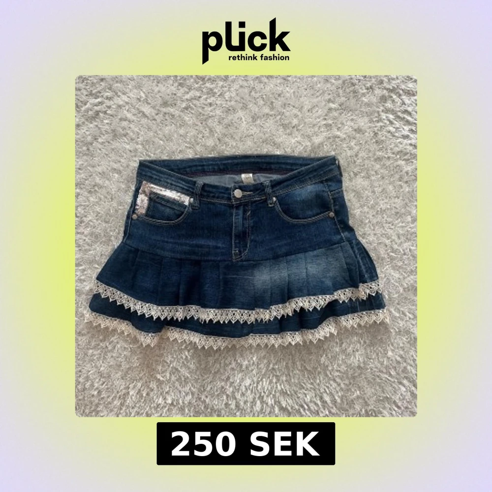En lågmidjad jeanskjol omsydd från ett par jeans. Midjemått tvärsöver - ca 39cm Längd - 33cm