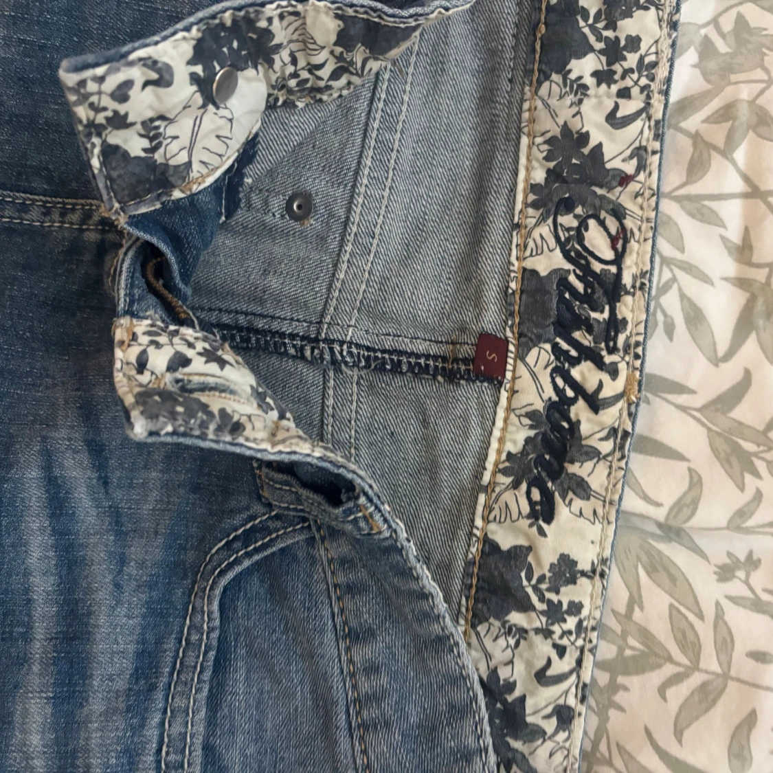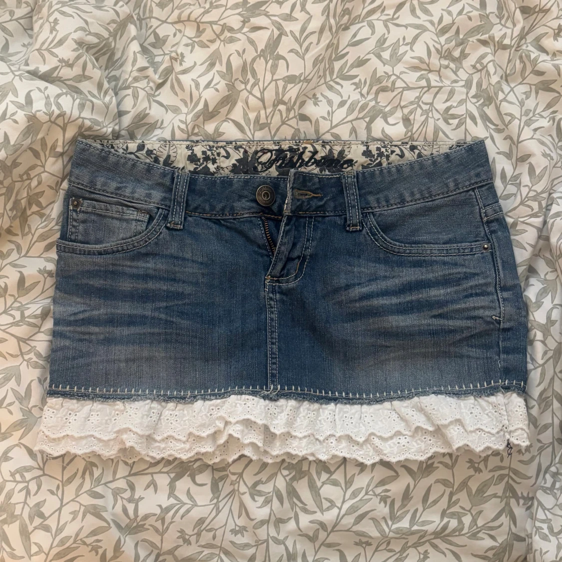 Supersöt jeanskjol från Fishbone i klassisk blå denim med egensydd vit broderad spetsvolang längst ner. Kjolen har fem fickor, bälteshällor och knapp- och dragkedjestängning. Insidan har blommigt tygdetalj. Perfekt för dig som gillar en mix av denim och romantiska detaljer. Den är assnygga men tyvärr lite för liten så säljer den istället. Midjemått rakt över är 38cm, längd fram är 26 och längd bak är 30.