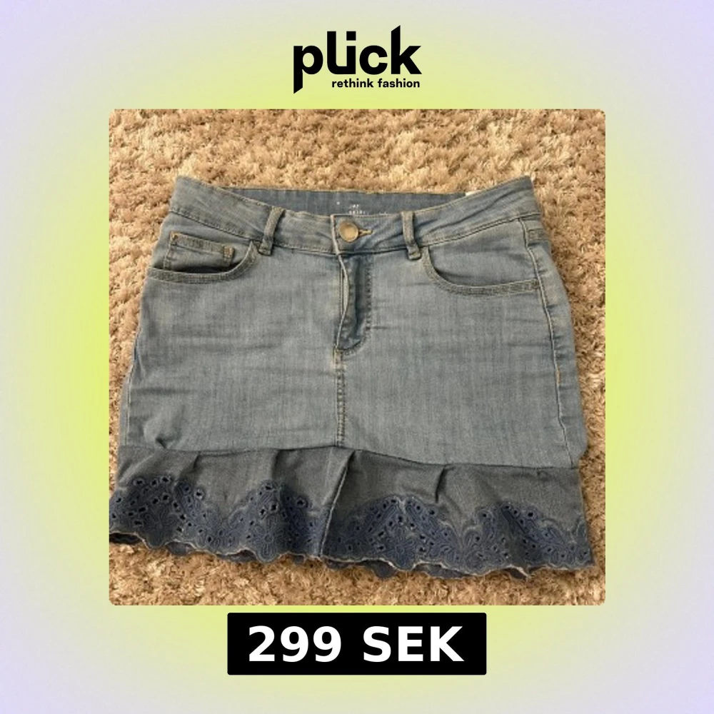 Snygg ljusblå jeanskjol från JAY med volang och broderad spetskant längst ner. Klassisk femficksmodell med knapp och dragkedja framtill. Perfekt för dig som gillar denim med en söt twist.