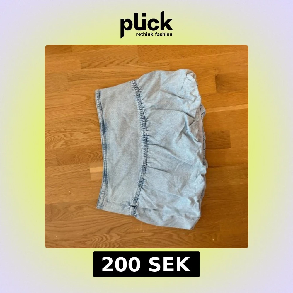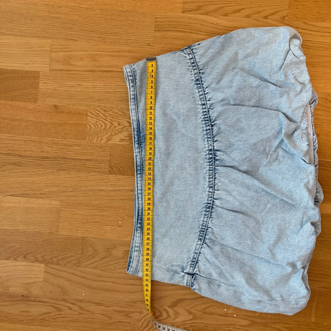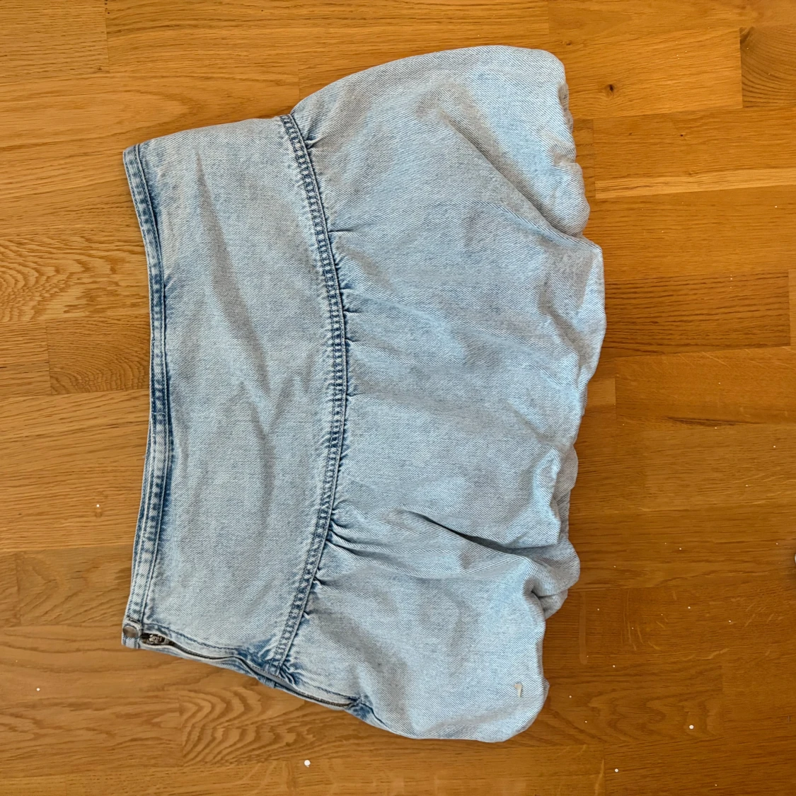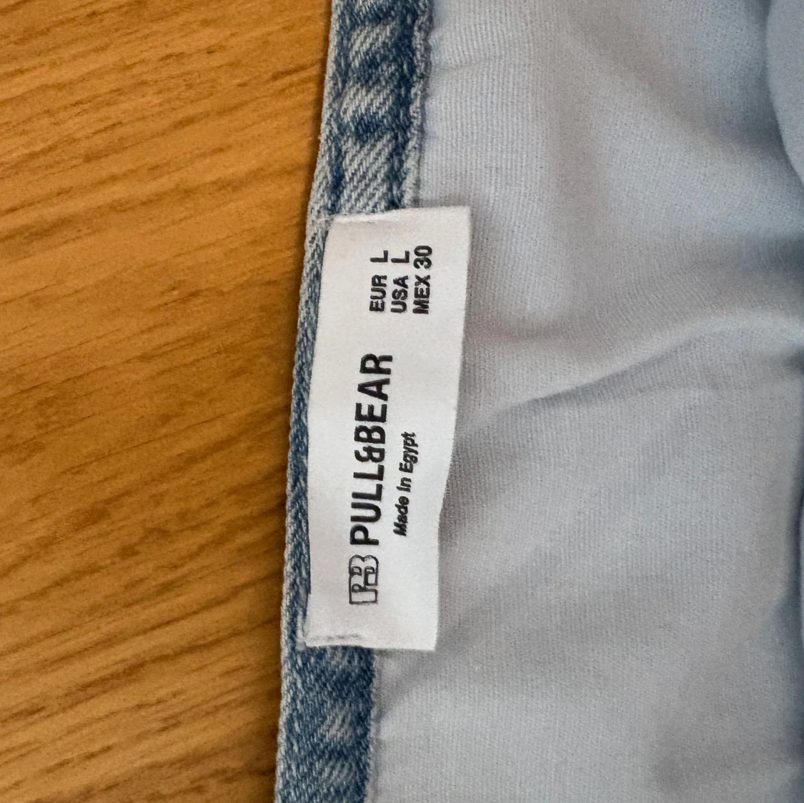 Supersöt ljusblå jeanskjol från Pull&Bear i storlek L men passar M. Kjolen är kort, har en volangig och lätt puffig form med markerad söm i midjan.