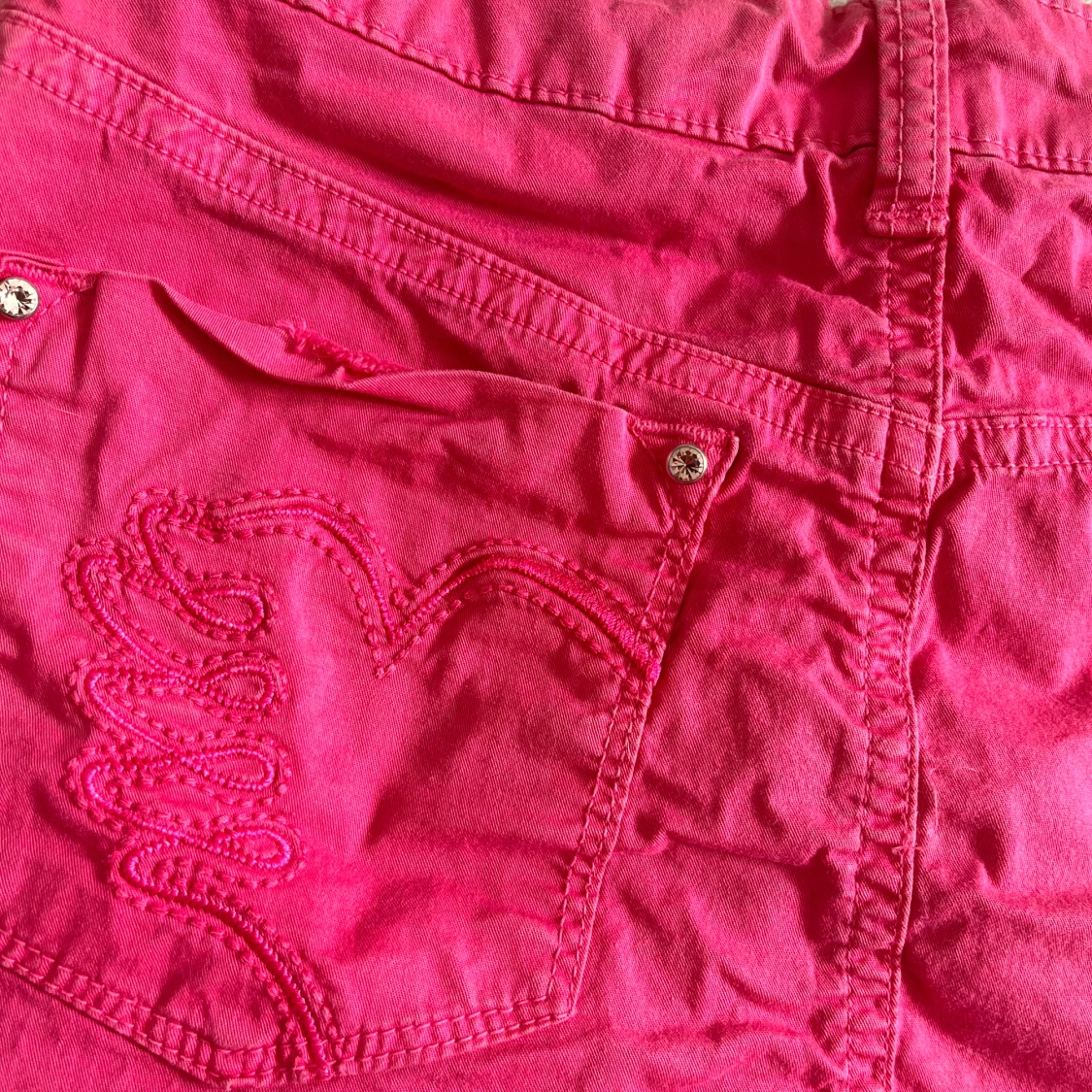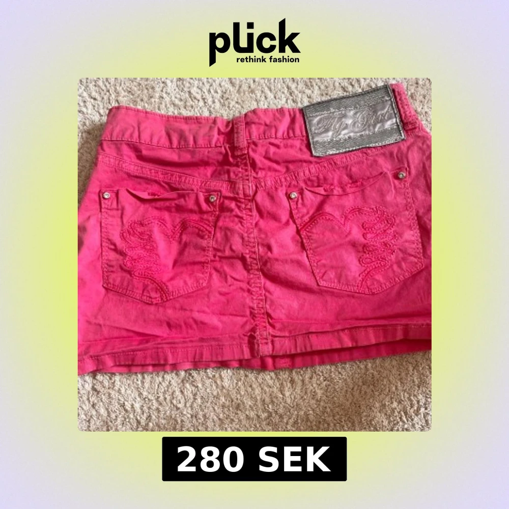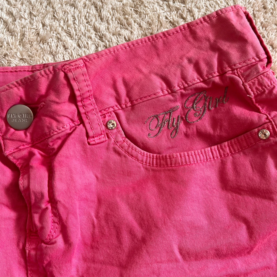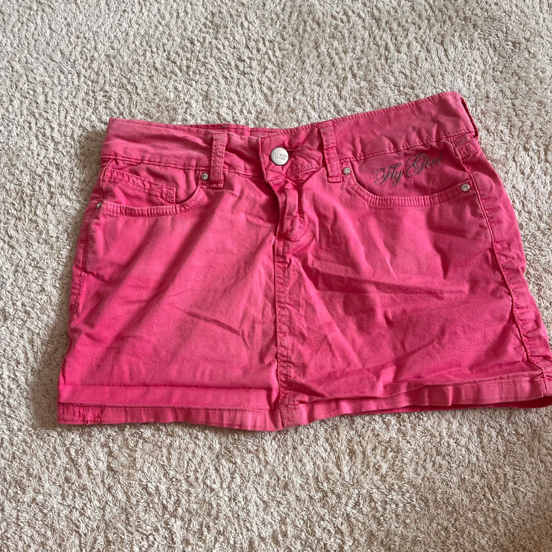 Snygg rosa jeanskjol från Fly Girl med broderade detaljer på bakfickorna och silvrig logga framtill. Klassisk femficksmodell med knapp och dragkedja. Perfekt för dig som vill sticka ut med färg och coola detaljer. 2000 tal stil och unikt!