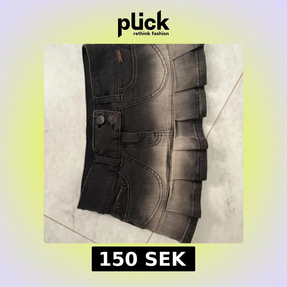 Superfin svart jeanskjol med cool tvättad effekt och plisserad nederkant. Kjolen har två knappar framtill, bälteshällor och bakfickor med hjärtformad söm. HELT oanvänd!!