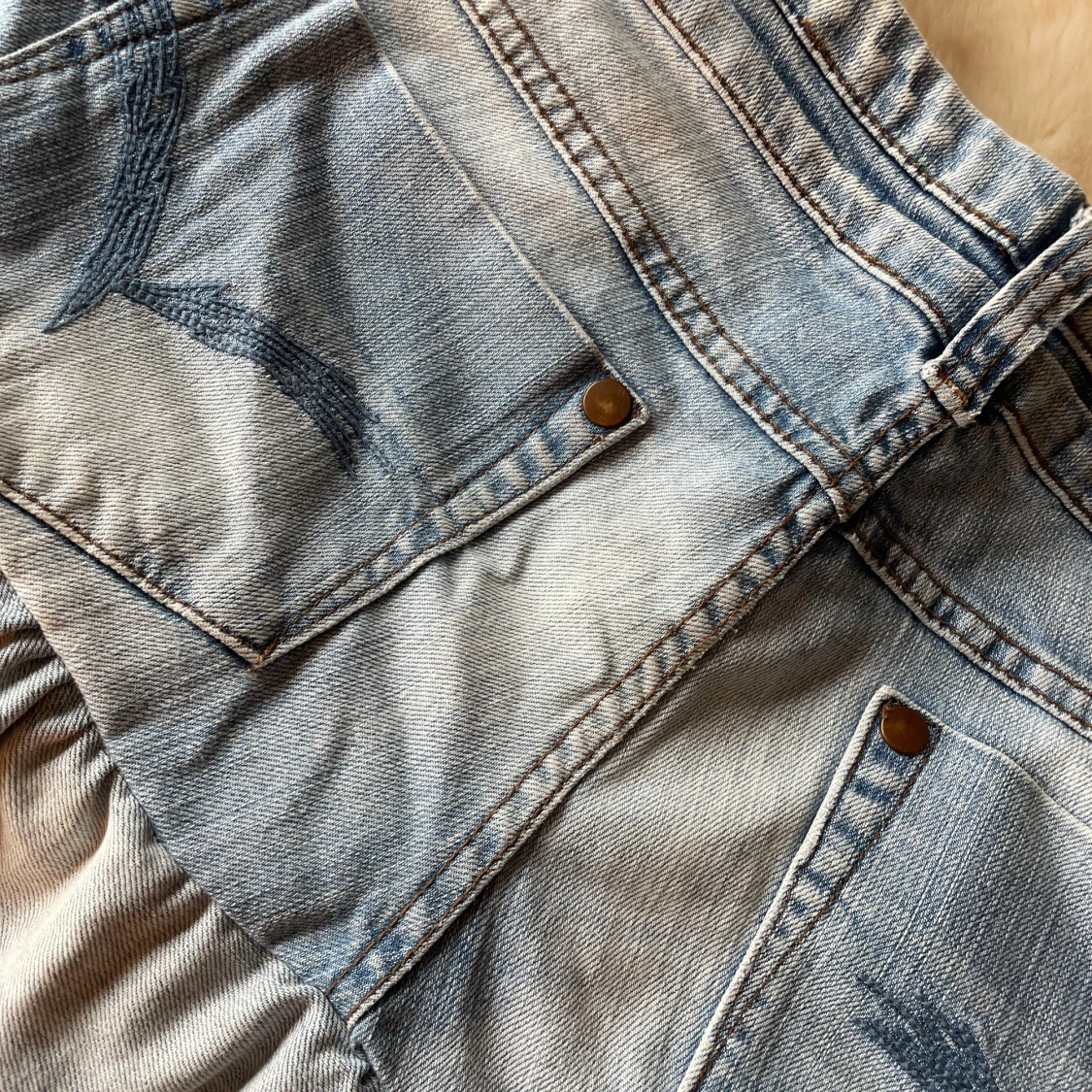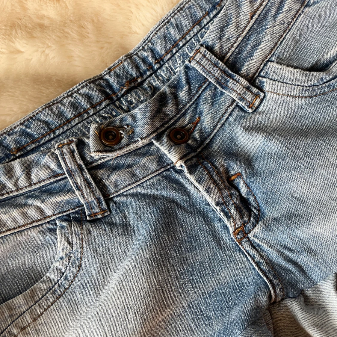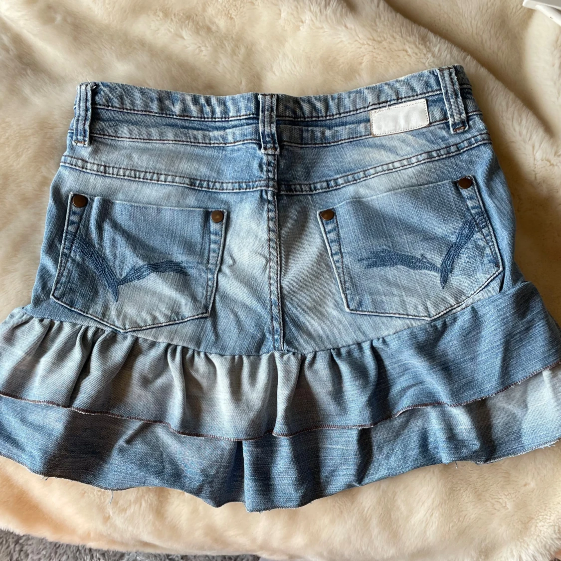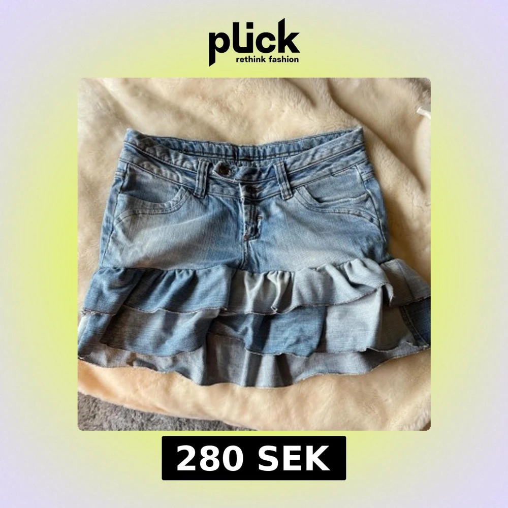 Snygg ljusblå jeanskjol med dubbla volanger nertill och klassiska jeansfickor både fram och bak. Kjolen har bälteshällor, dubbla knappar och dragkedja framtill. Perfekt för dig som gillar en cool och lekfull stil. Köpt här på plick men passar inte mig