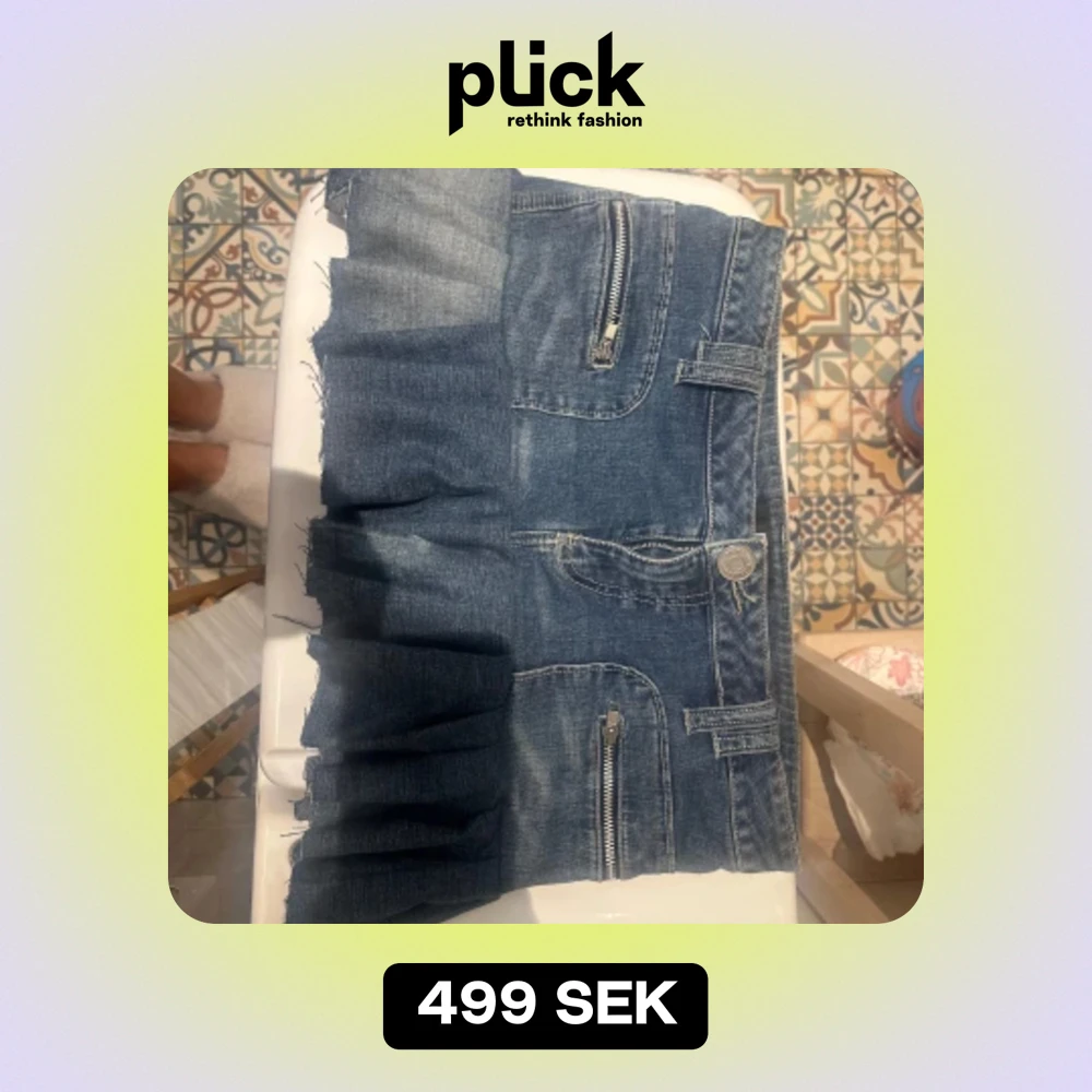Jättefin och cool omsydd jeanskjol med volanger😇 storleken i jeansen innan var st L men skulle inte säga att det sitter så längre. Den sitter snarare som en M/S 😇skriv för måtten!😇💕