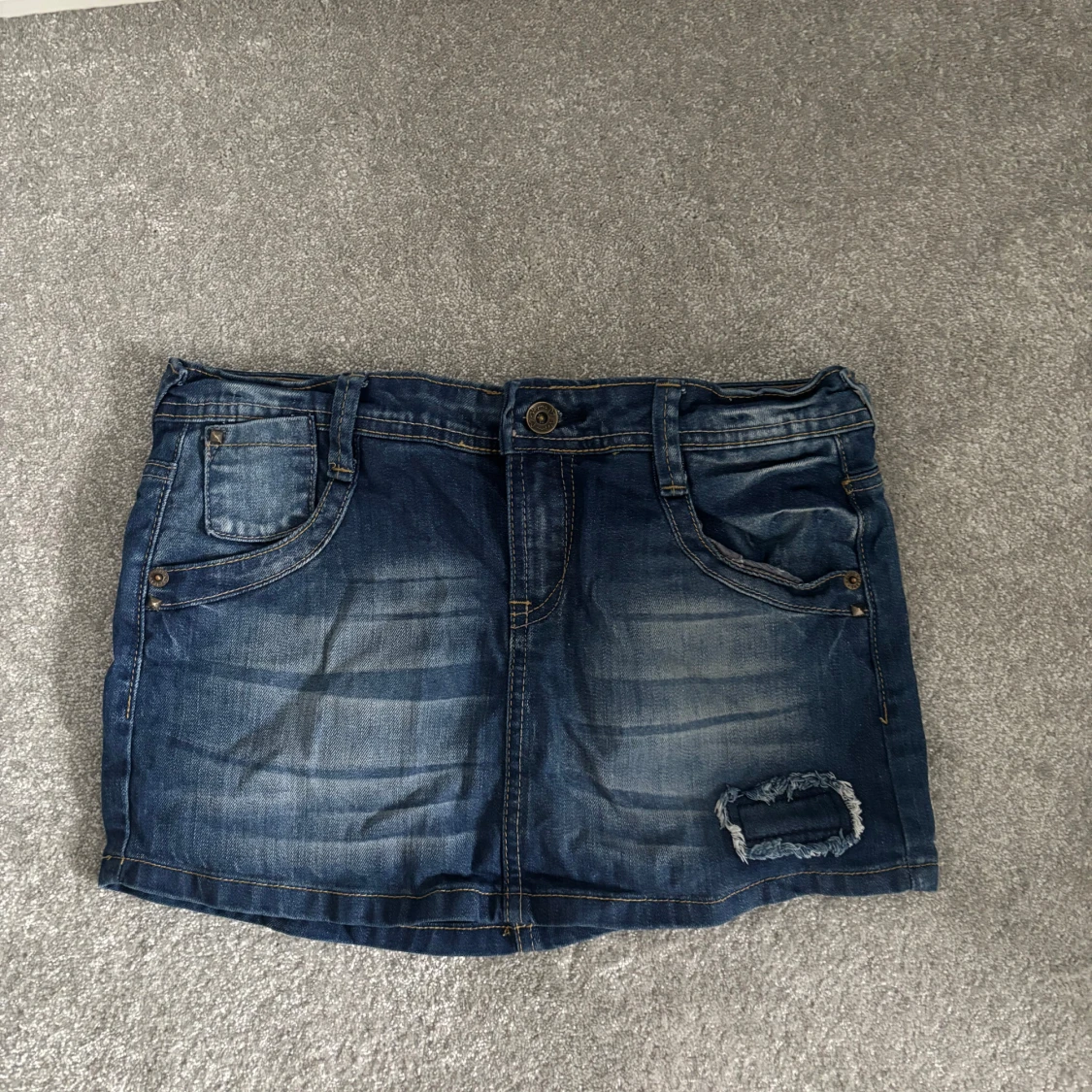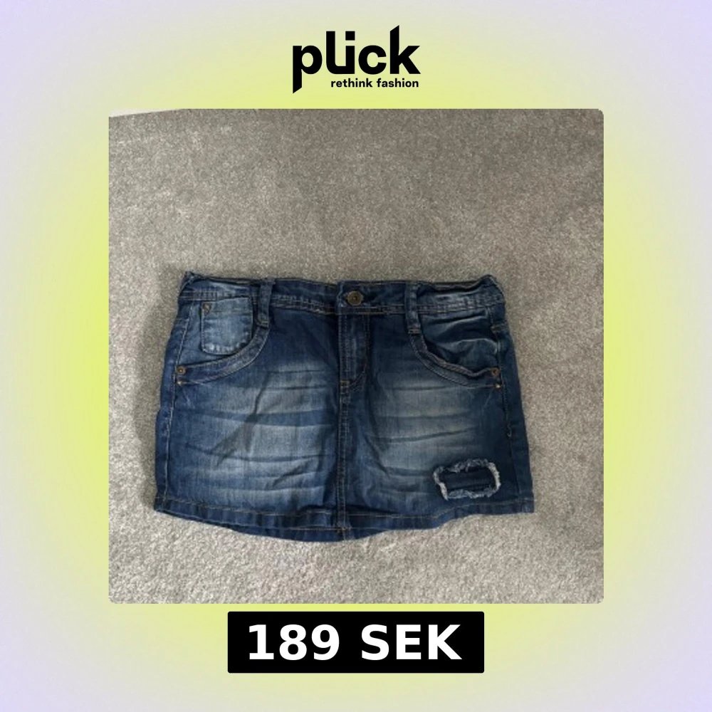 Snygg blå jeanskjol i kort modell med slitning framtill och coola brun glittriga detaljer på bakfickorna. Kjolen har klassiska fickor, bälteshällor och knappstängning. Perfekt för dig som gillar en avslappnad och trendig stil.