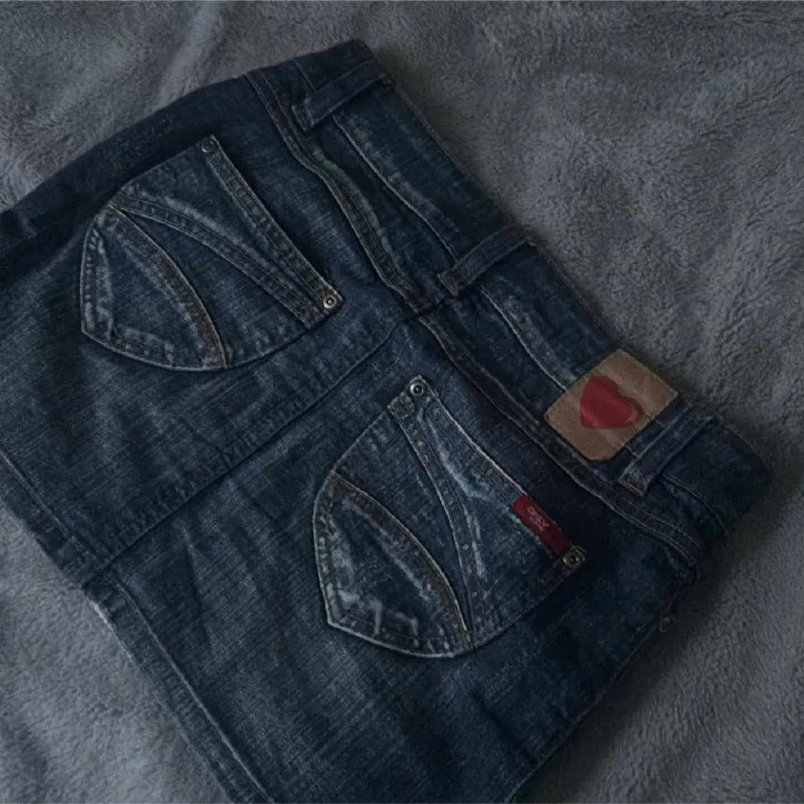 Mörkblå jeanskjol med slitningar och hjärtdetalj