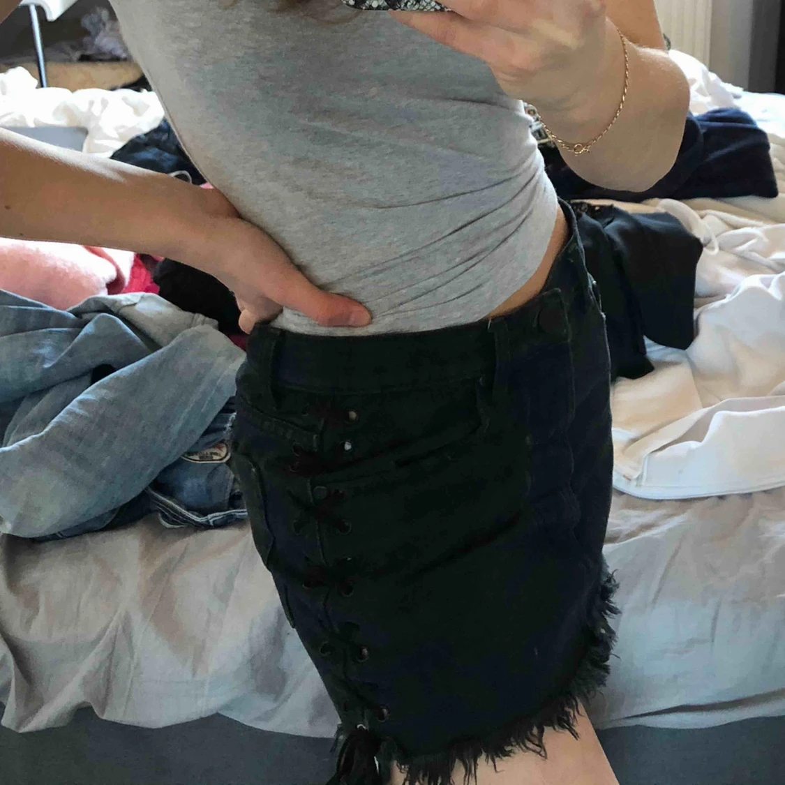 Jeanskjol från junkyard med snörning på sidorna, den är kortare framtill och längre där bak. Säljer den pga att den är för stor på mig som vanligtvis bär S. Använd ngn gång<33