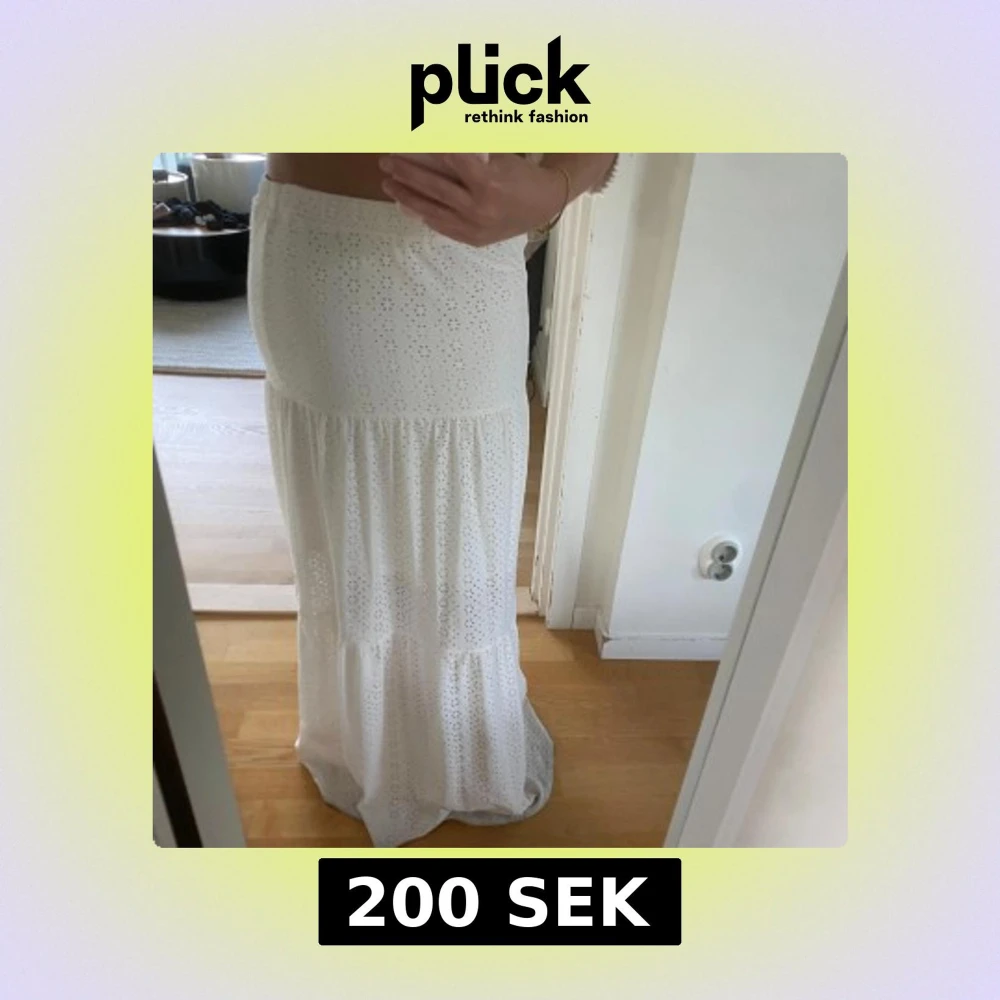 Säljer en vit långkjol med broderade hål i blommönster. Kjolen har en luftig och flowy passform med volangdetalj nedtill. Perfekt för varma dagar och ger en romantisk känsla till outfiten. Obs lite smutsig nedtill då den skrapat i marken😊Barnstorlek 158-164