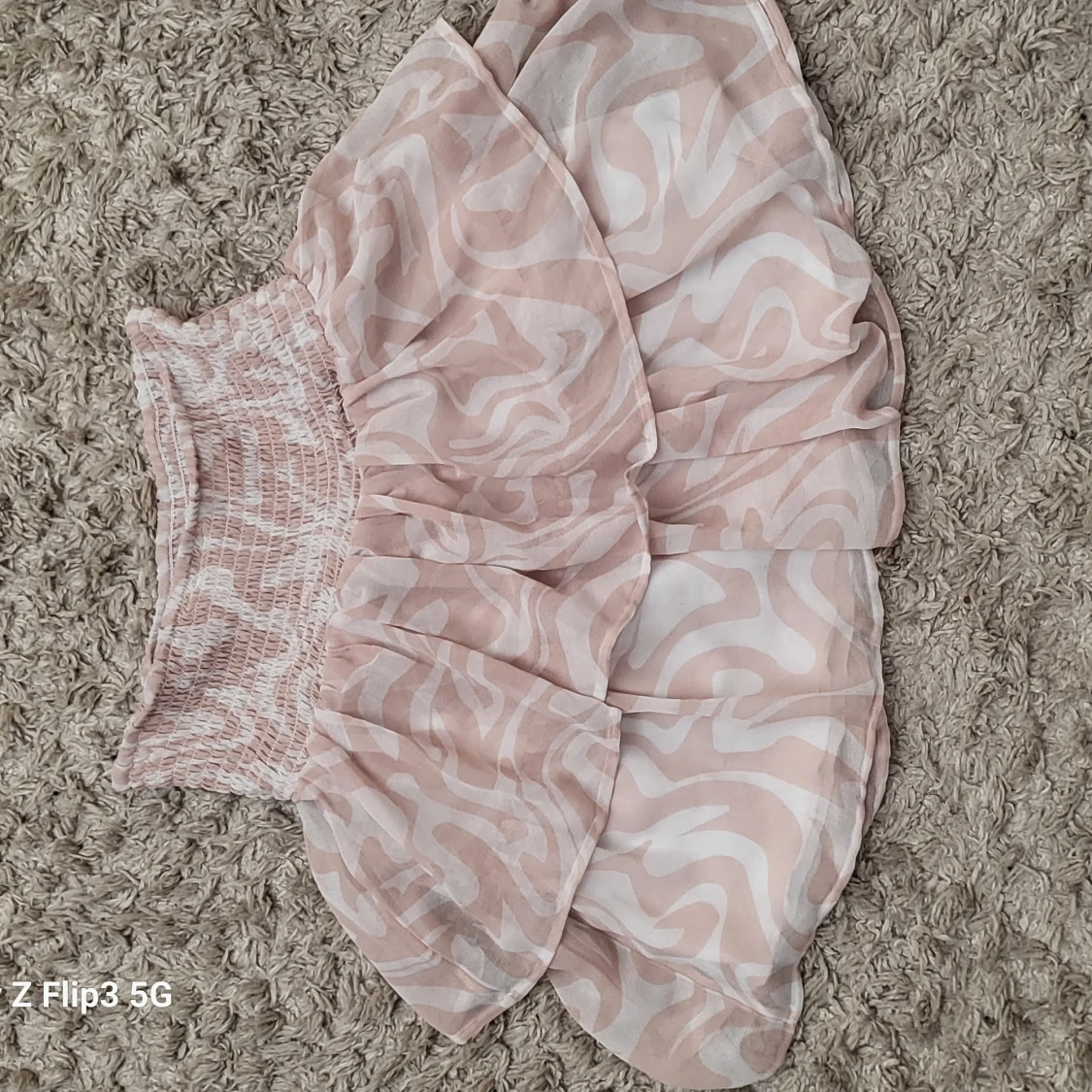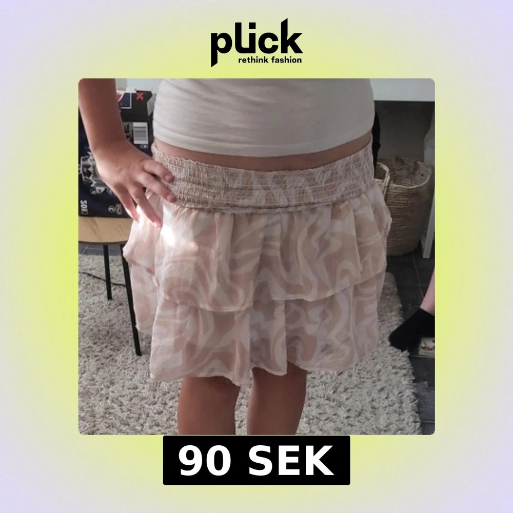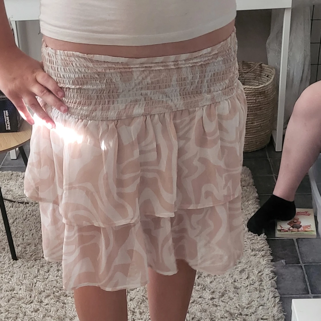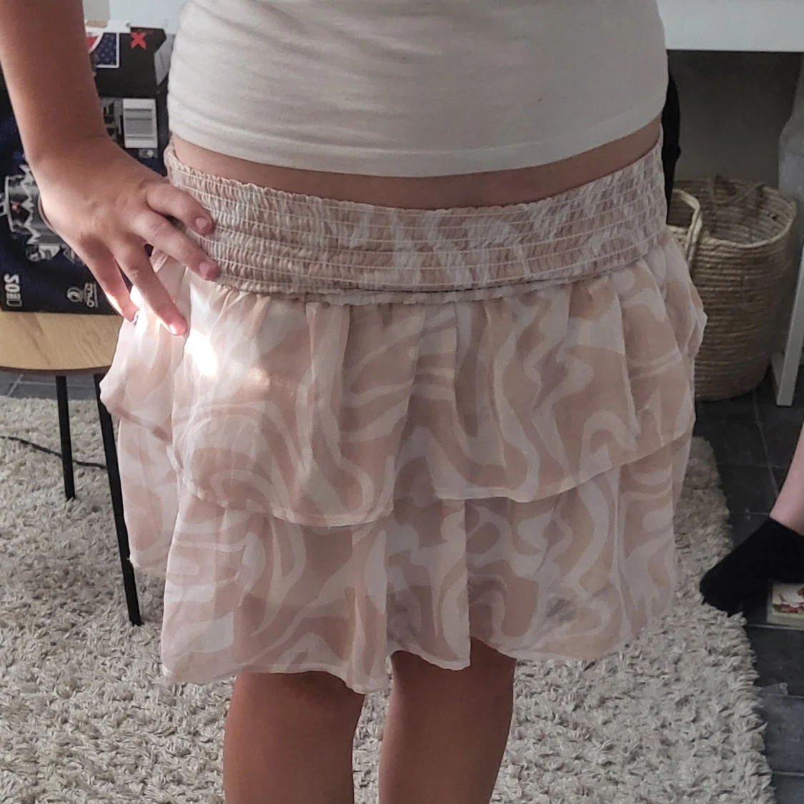 Supersöt kort volangkjol i beige/ rosa och vitt med abstrakt mönster. Kjolen har bred, smockad midja som är stretchig och två lager volanger i ett tunt, luftigt material. Perfekt för dig som gillar en feminin stil.